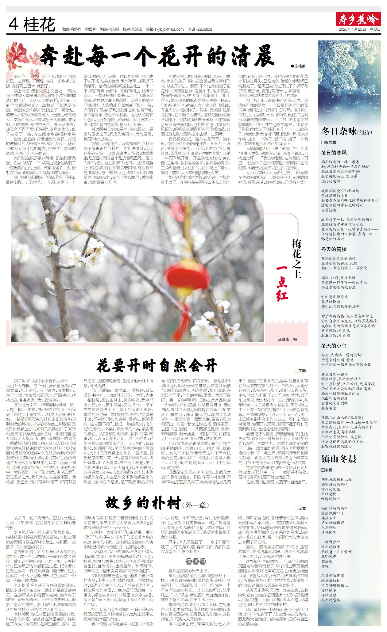 老朴树走过了百年历程,从没有走出过村庄,像一个忠诚的汉子固守在故乡这片土地上,守住根,用自己的一生。老朴树将村里的风云变幻都记在心里,记录着村里发生的每一件悲欢离合,惦记着村里出没的每一个人,也惦记着村庄里的每一个脚步和每一缕炊烟。