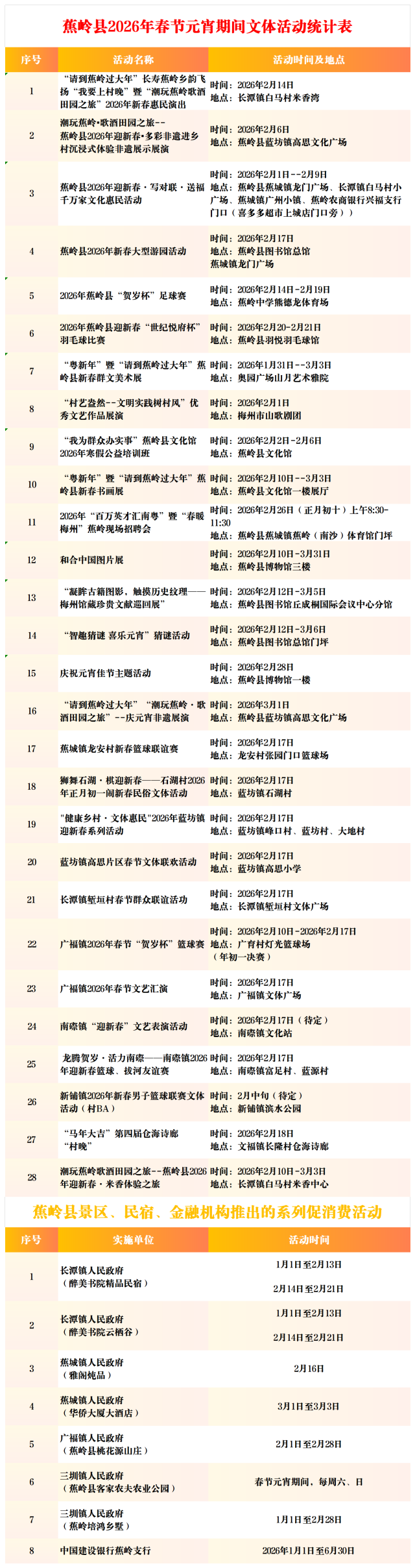 2月17日,蕉城镇龙安村新春篮球联谊赛将在龙安村张园门口篮球场精彩上演,赛事鼓励“企业队+村集体队+返乡青年队”组队参赛,村集体队可由村民、种植户组成。获胜队伍将获得“乡村助农礼包”,礼包内容为优先采购当地农产品,以此激发村民参与热情,带动乡村消费、展示乡土特色。“我们希望通过丰富的活动,让市民游客在蕉岭既能感受传统文化的厚重,也能体验现代文旅的活力。”蕉岭县文化广电旅游体育局相关负责人表示,春节元宵期间,所有活动均免费或低价开放,部分乡村活动还提供“吃住行游”一站式服务,切实让游客“玩得开心、过得舒心”。