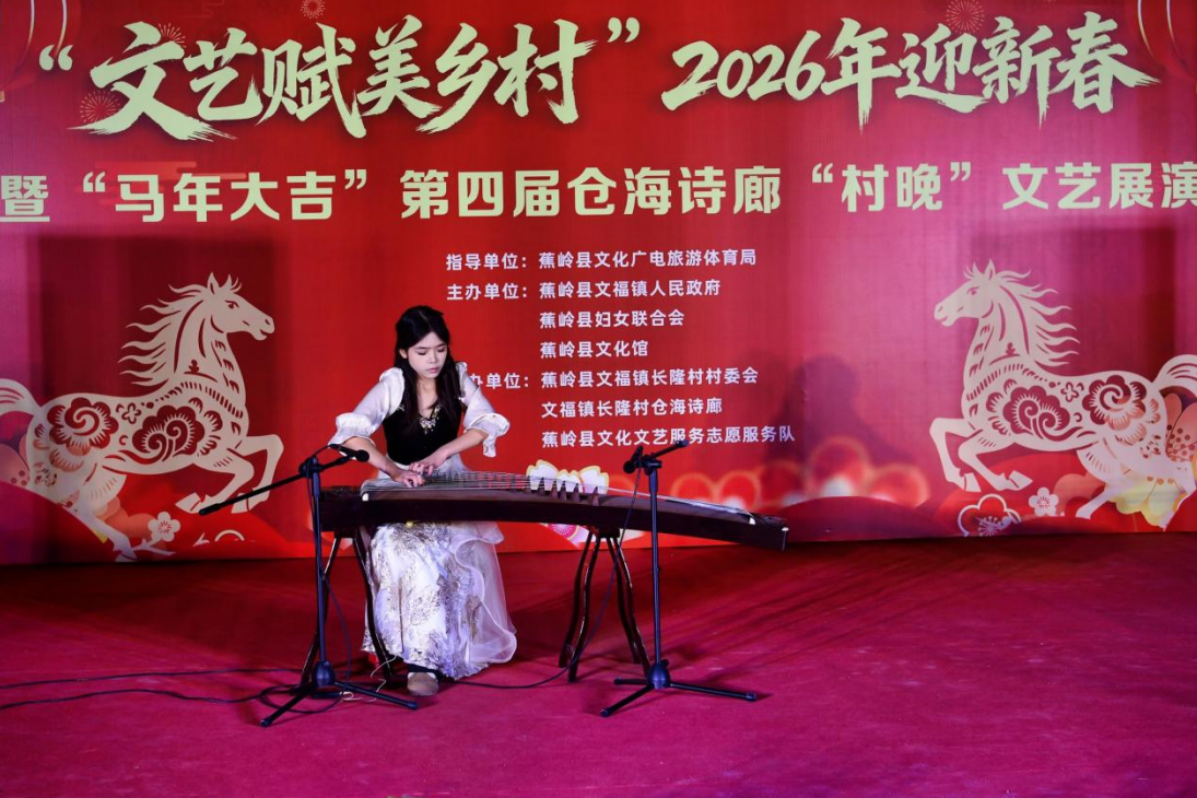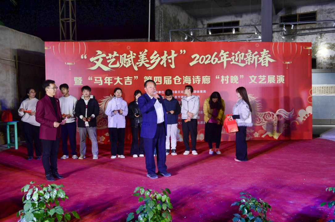 活动当晚,仓海诗廊大榕树下人声鼎沸。晚会在震天动地的《迎春大锣鼓》中拉开序幕,文福酒香鼓舞队激昂的鼓点瞬间点燃了全场的热情。舞台上,五彩斑斓的灯光与喜庆的装饰交相辉映,台下座无虚席。