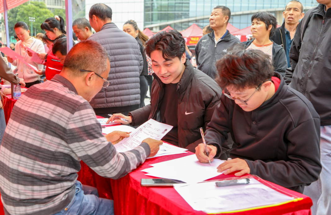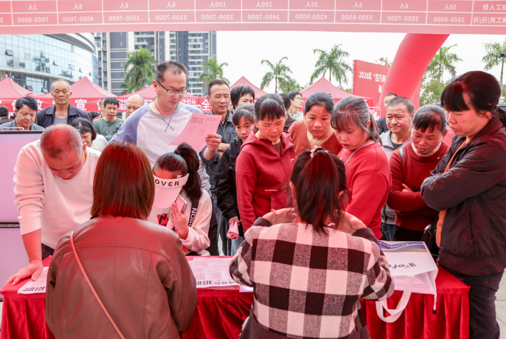 “厂里包吃住吗?月薪多少?”面对求职者的询问,招聘人员耐心解答:“我们厂有班车接送,包食宿。刚开始上班按计时,保底工资2600,超过了计件工资就按计件工资结算。”这样的对话在现场此起彼伏,供需双方围绕薪资、福利、发展前景展开深入交流。
