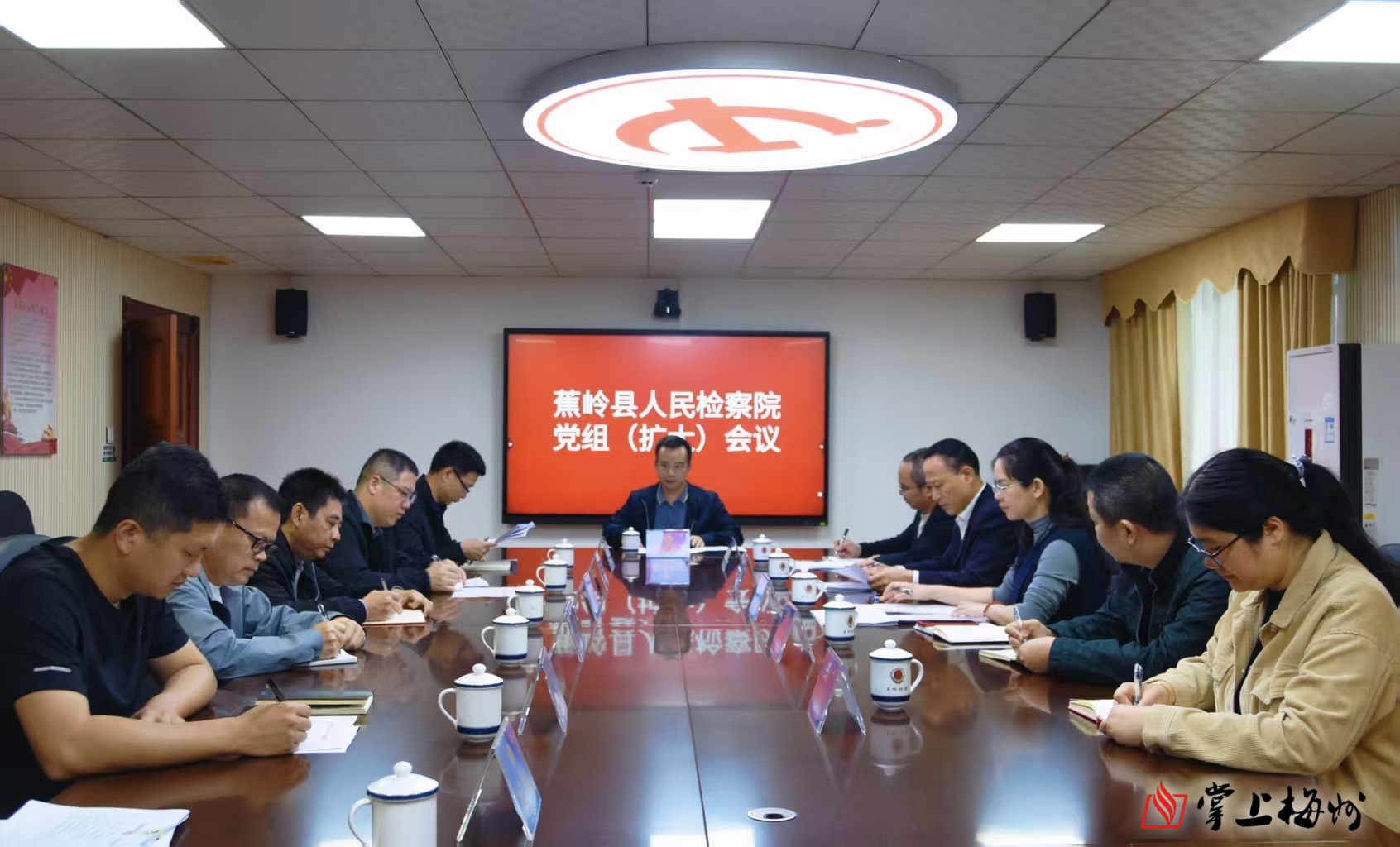 掌上梅州讯 近日,蕉岭县检察院召开党组(扩大)会,传达学习全市检察长会议精神,研究具体落实措施、部署全年工作任务。会议由该院党组书记、检察长温建文主持,县纪委监委第六派驻纪检监察组组长黄裕列席会议,班子成员、检委会专职委员、各部室负责人参加会议。