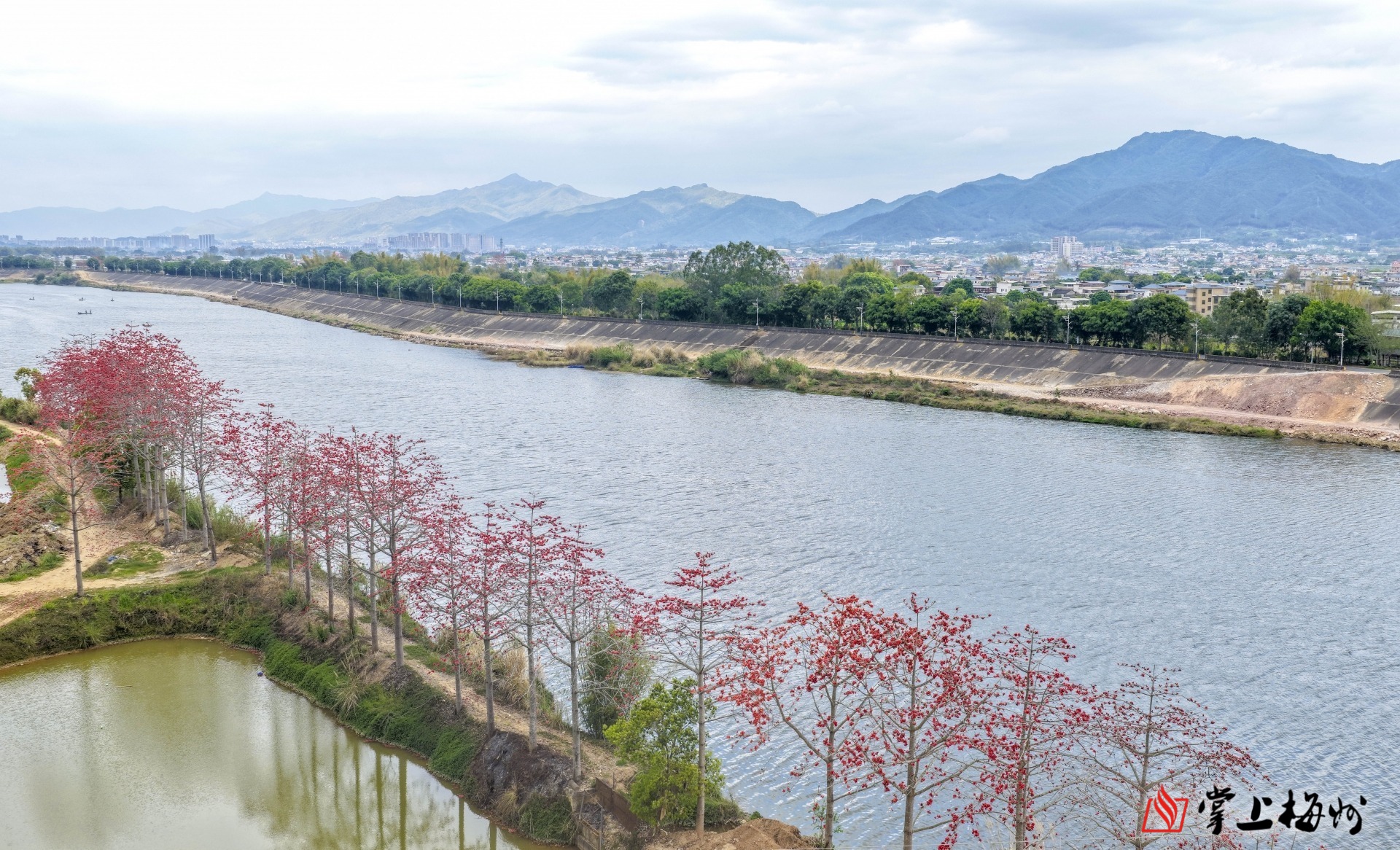 三圳镇顺岭村横龙片区的河堤上,火红的木棉花竞相绽放。(汪敬淼 摄)