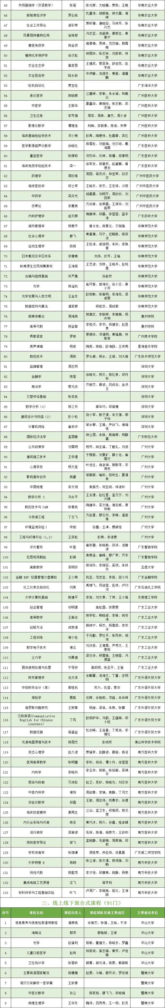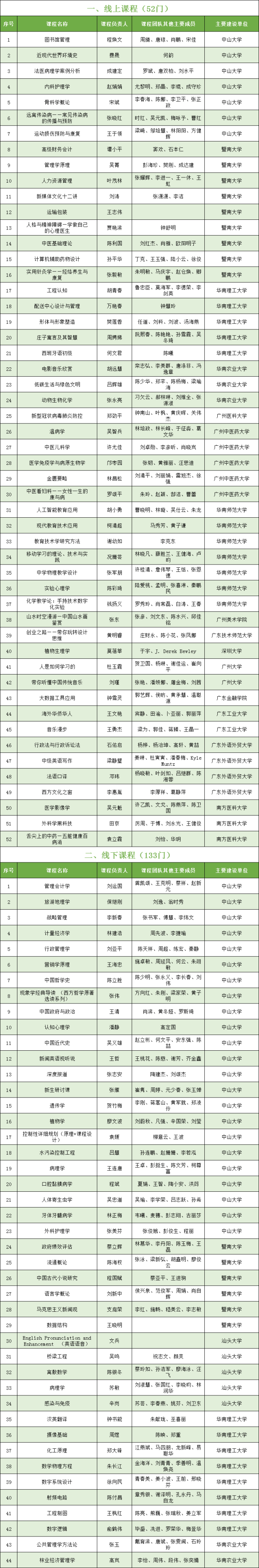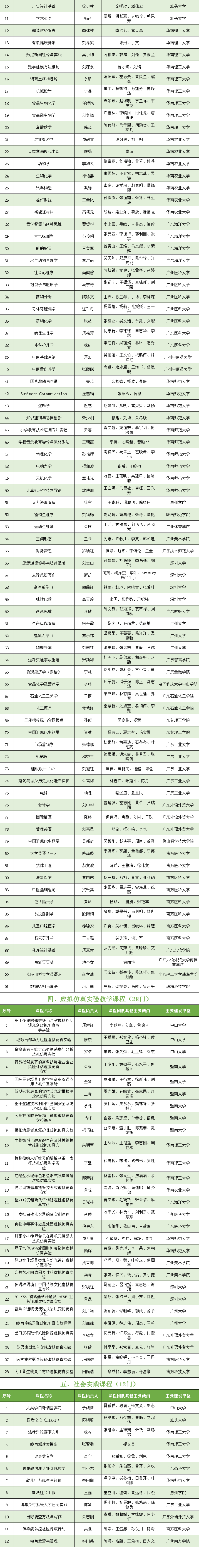 从拟入选学校分布来看,我省共有37所高校课程入选,较上届扩大8所,入选20门以上的高校共6所,分别为中山大学(39门)、华南师范大学(29门)、华南理工大学(28门)、暨南大学(25门)、南方医科大学(23门)、华南农业大学(21门),入选10门以上的高校也有6所,包括广州大学(17门)、广东外语外贸大学(16门)、广东工业大学(15门)、深圳大学(14门)、广州医科大学(12门)、广州中医药大学(11门)。