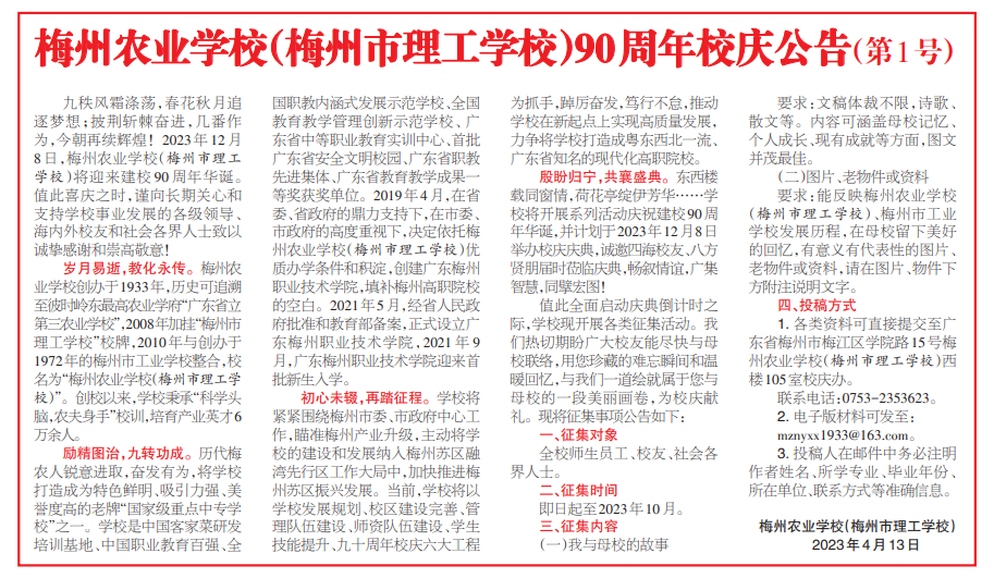 2023年12月8日,梅州农业学校(梅州市理工学校)将迎来建校90周年华诞。这是学校发展史上的一件大事、喜事和盛事。值此全面启动庆典倒计时之际,学校现开展各类征集活动,可以写写“我与母校的故事”,或者是您珍藏的能反映梅州农业学校(梅州市理工学校)、梅州市工业学校发展历程,在母校留下的美好回忆,有意义有代表性的图片、老物件或资料等。届时梅州农业学校将举办系列校庆活动,进一步凝聚智慧,汇聚力量,携手新征程,奋进再出发。