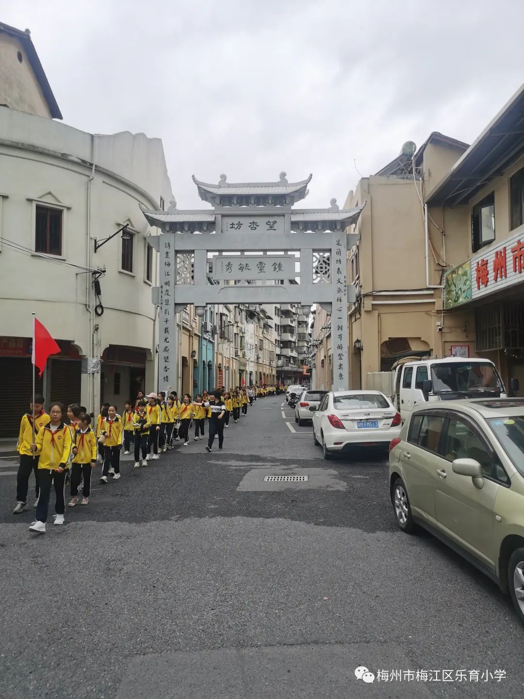 4月2日下午,四、五年级的少先队员们整装待发,身着校服,佩戴红领巾,手持少先队员队旗,在教学楼前以班为单位进行集中。为保证此次活动能顺利安全开展,邹强富校长在研学活动开始前对学生们进行本次研学活动的安全教育,介绍了本次研学的步行路线和强调了注意事项后,学校领导及四、五年级的学生们和老师们整队从学校出发,沿着梅州古城老街,到达梅州学宫。