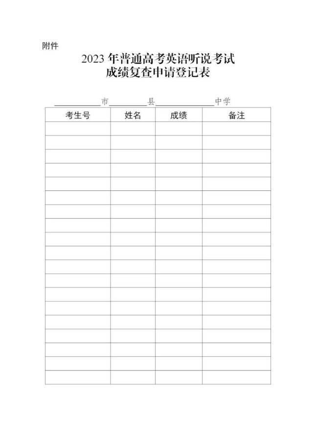 附件:2023年普通高考英语听说考试成绩复查申请登记表