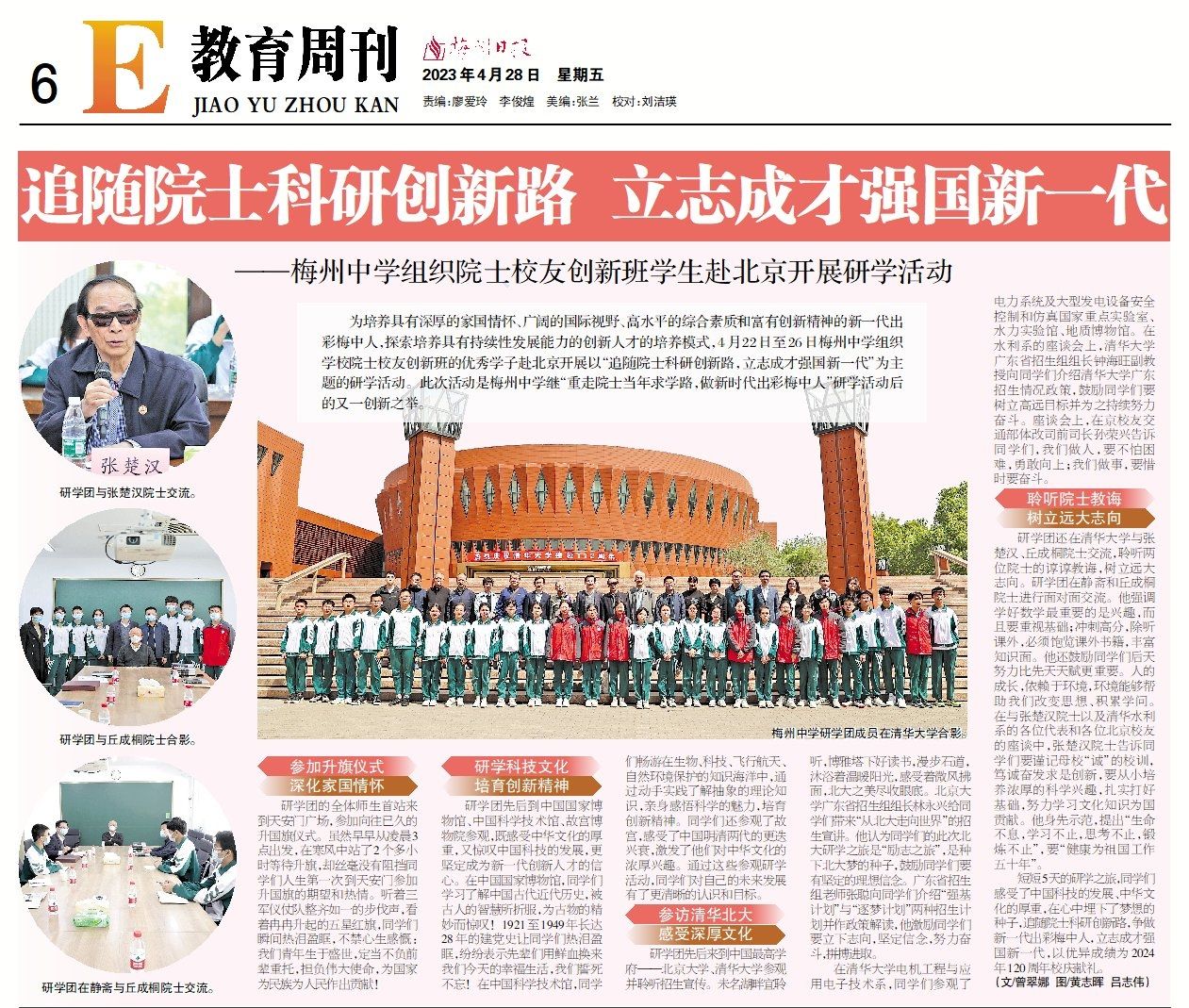 为培养具有深厚的家国情怀、广阔的国际视野、高水平的综合素质和富有创新精神的新一代出彩梅中人,探索培养具有持续性发展能力的创新人才的培养模式,4月22日至26日梅州中学组织学校院士校友创新班的优秀学子赴北京开展以“追随院士科研创新路,立志成才强国新一代”为主题的研学活动。此次活动是梅州中学继“重走院士当年求学路,做新时代出彩梅中人”研学活动后的又一创新之举。