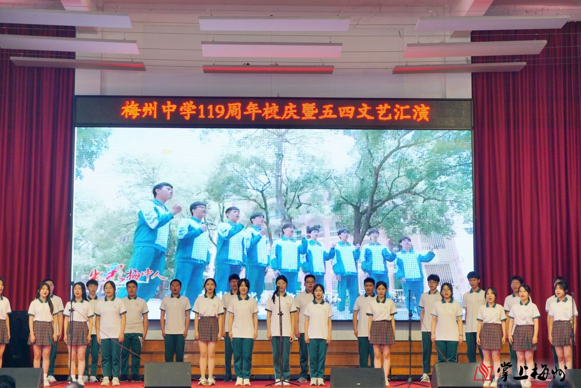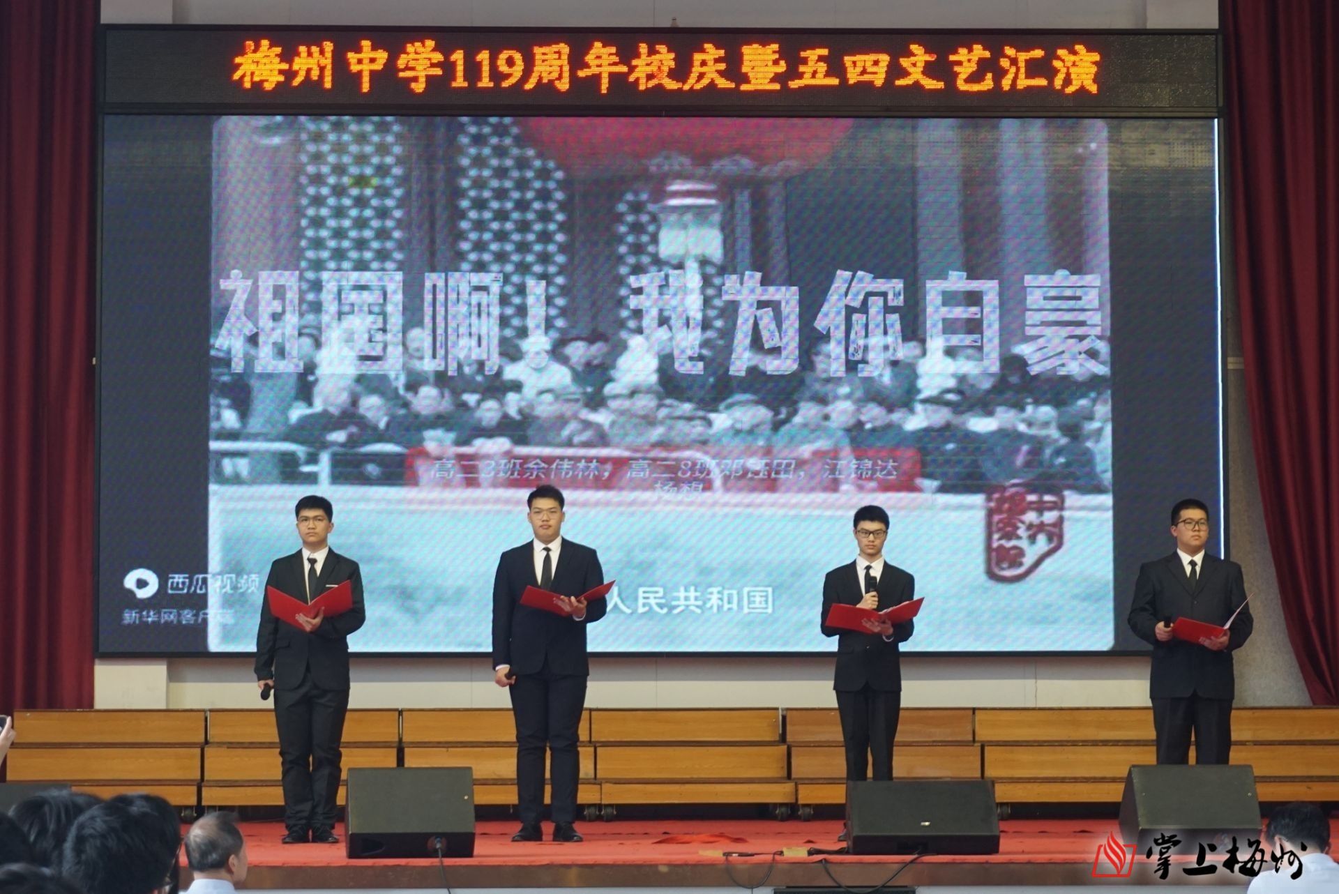 “五岭东趋尽揭扬,中有梅花香。横枝独傲冰雪里,畸人节士代相望……”文艺汇演上,朗朗上口、节律铿锵的梅州中学校歌传来,台下不少师生校友轻声合唱,深深感染了在场观众。一首由梅州中学罗庆松校长及老师一起作词作曲,全校师生一起参演制作的歌曲《出彩梅中人》,更将母校与莘莘学子之间的深情厚谊诠释得淋漓尽致,展现了梅州中学师生团结一致,发奋图强,圆梦梅中的信心与决心。当天还举行了足球友谊赛、师生书画展庆祝活动。高二3班的学生陈润康说:“今天是学校建校119周年校庆,作为一名梅州中学的学生,我感到非常荣幸和自豪,以后我将继续努力学习文化知识,提高自己的文化素养,让母校以我为荣。”