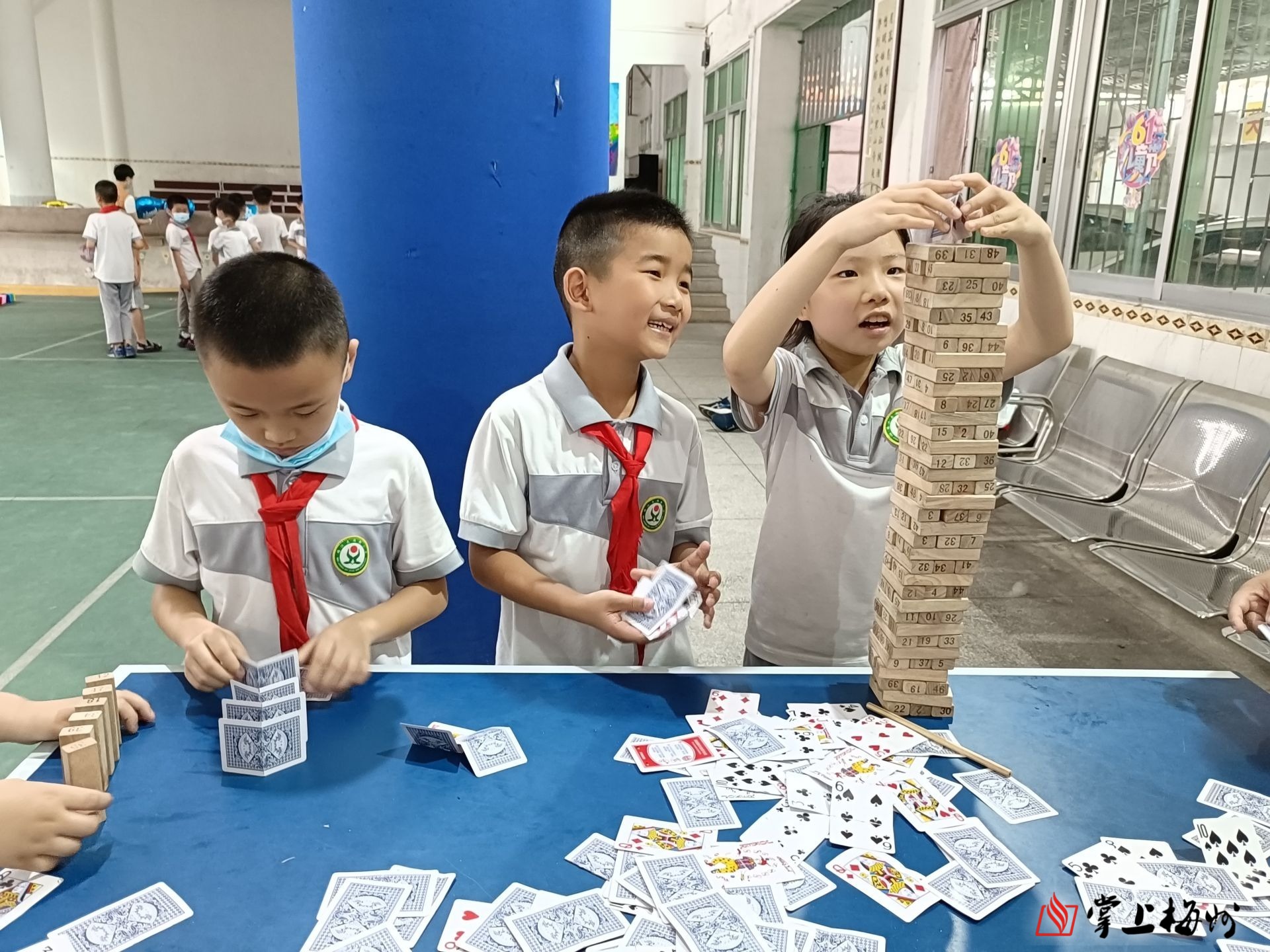 梅江区作新小学第五届校园科技节现场,学生们在进行搭高塔挑战。(学校供图)