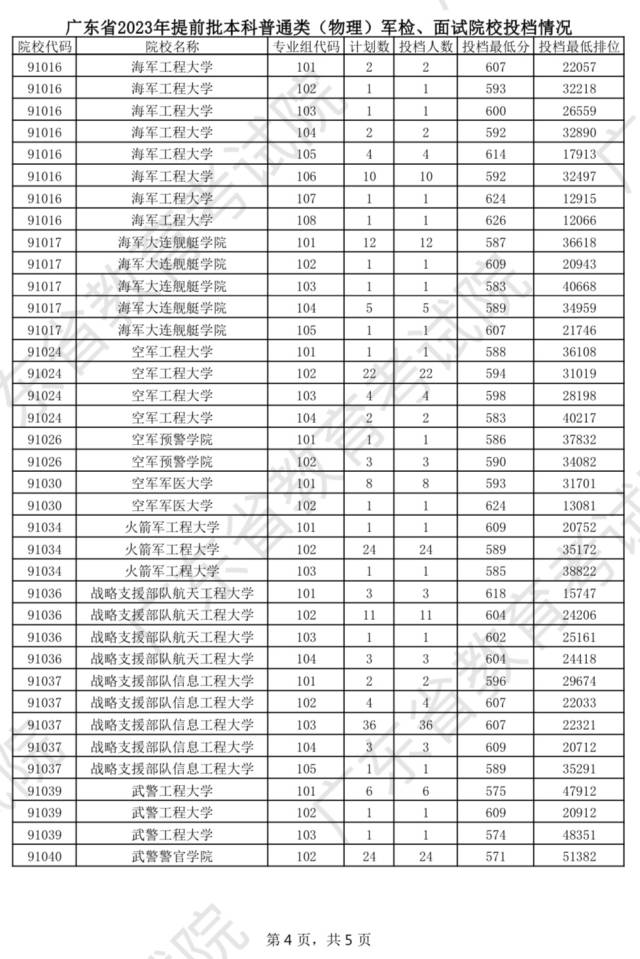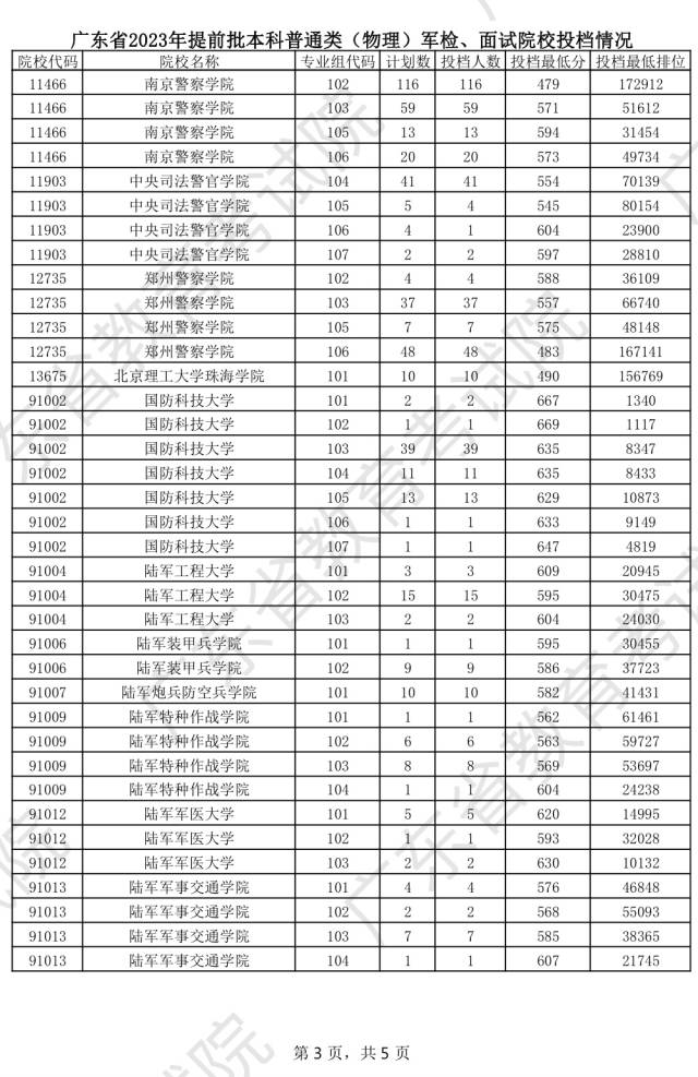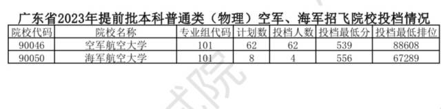 7月11日,记者从广东省教育考试院获悉,广东2023年夏季普通高校招生录取工作于7月9日正式开始。省招生办对提前批普通类的空军、海军招飞院校和军检院校,以及提前批独立设置本科艺术院校(含参照)及经批准的院校(专业)的统考+校考类别进行了投档录取。军检、空军、海军院校共投出3415人。