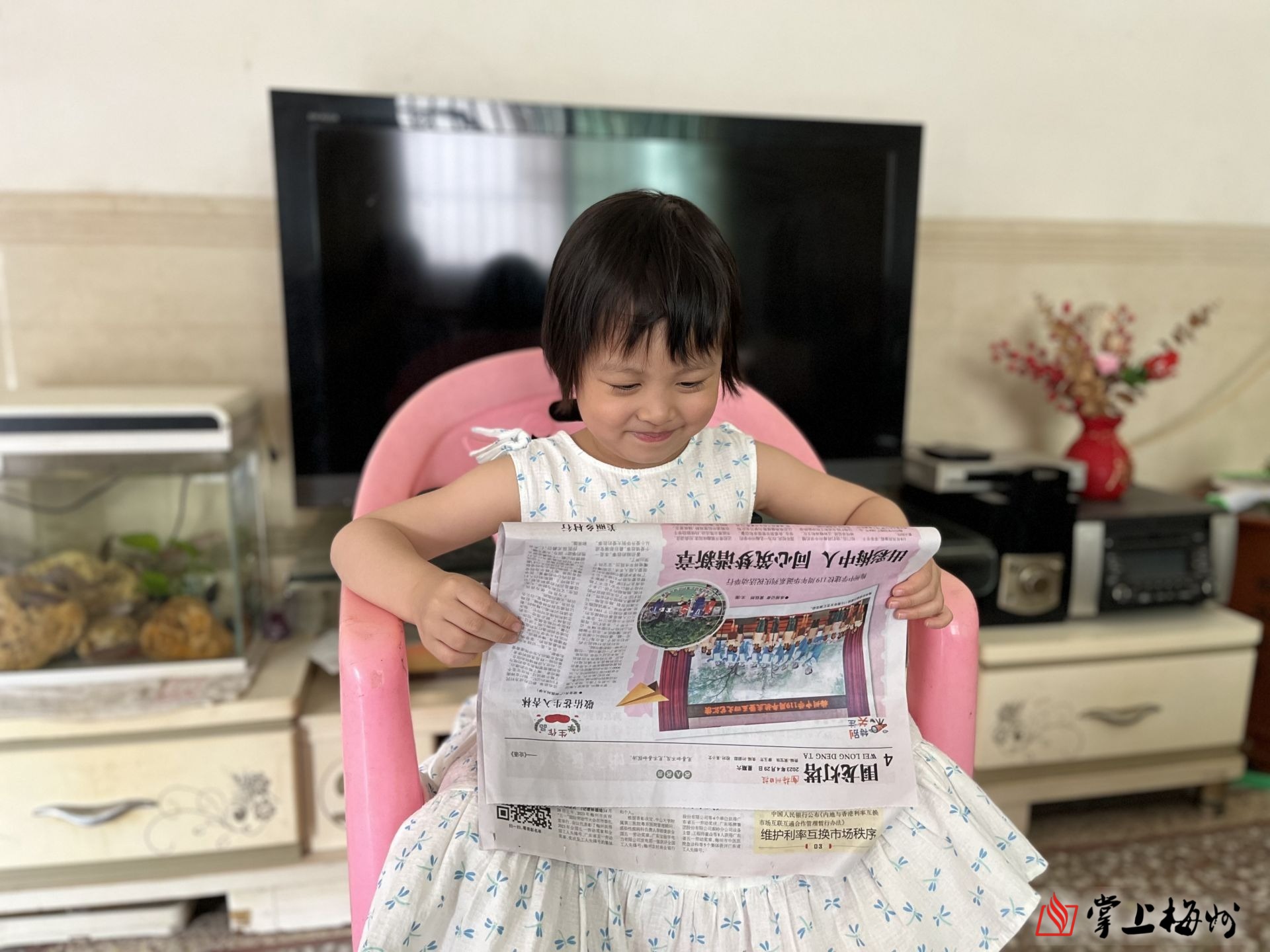 小家伙从小爱读书看报,一直对《梅州日报·围龙灯塔》情有独钟。每期报纸一发下来,小家伙就迫不及待地坐上她专属的凳子,拿起报纸津津有味地看起来。她尤其喜欢里面的画作和学生文章,还说以后也要写文章在《梅州日报》上发表。