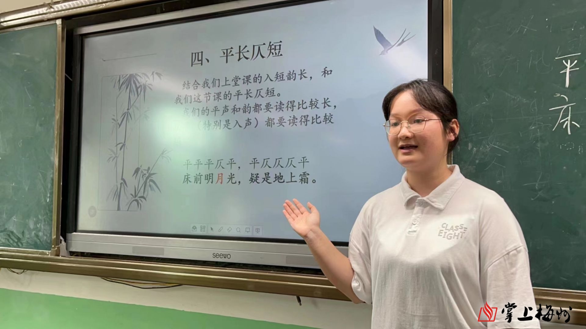 知音队队员梁芮瑞向学生介绍“平长仄短”的吟诵规则。