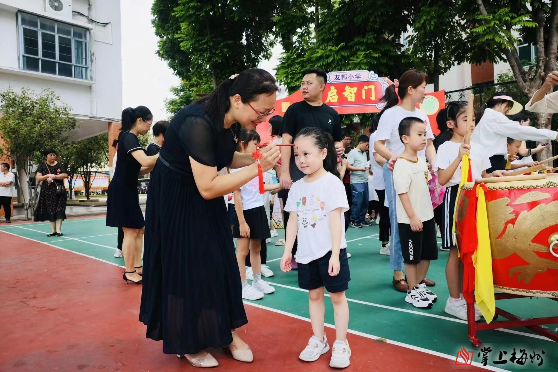 在蕉岭县友邦小学,记者发现,老师们正用笔蘸上朱砂,在孩子的额头正中点上红痣,“痣”意为“启智”,寓意着开启学童智慧,推开知识的大门。随后,孩子们在老师的指导下参加进智慧门、敲启智鼓、学写“人”字等活动,感受传统文化的魅力与熏陶。同时,学校还组织开展了升旗仪式、开学典礼和思政第一课等活动,活泼的身影跃动在生机复苏的校园里,向着新目标出发。活动中,友邦小学校长汤喜梅还为重返校园的学生致辞,她希望孩子们能够培养自信、刻苦、阳光等美好品德,抓住时光,奋发向上。