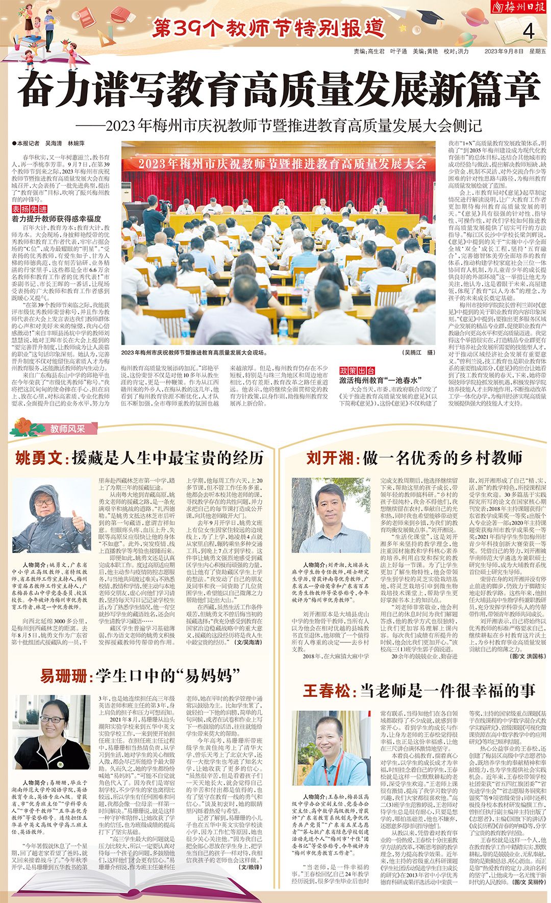 春华秋实,又一年树蕙滋兰,教书育人,再一季桃李芳菲。9月7日,在第39个教师节到来之际,2023年梅州市庆祝教师节暨推进教育高质量发展大会在梅城召开,大会表扬了一批先进典型,提出了“教育强市”目标,吹响了振兴梅州教育的冲锋号。
