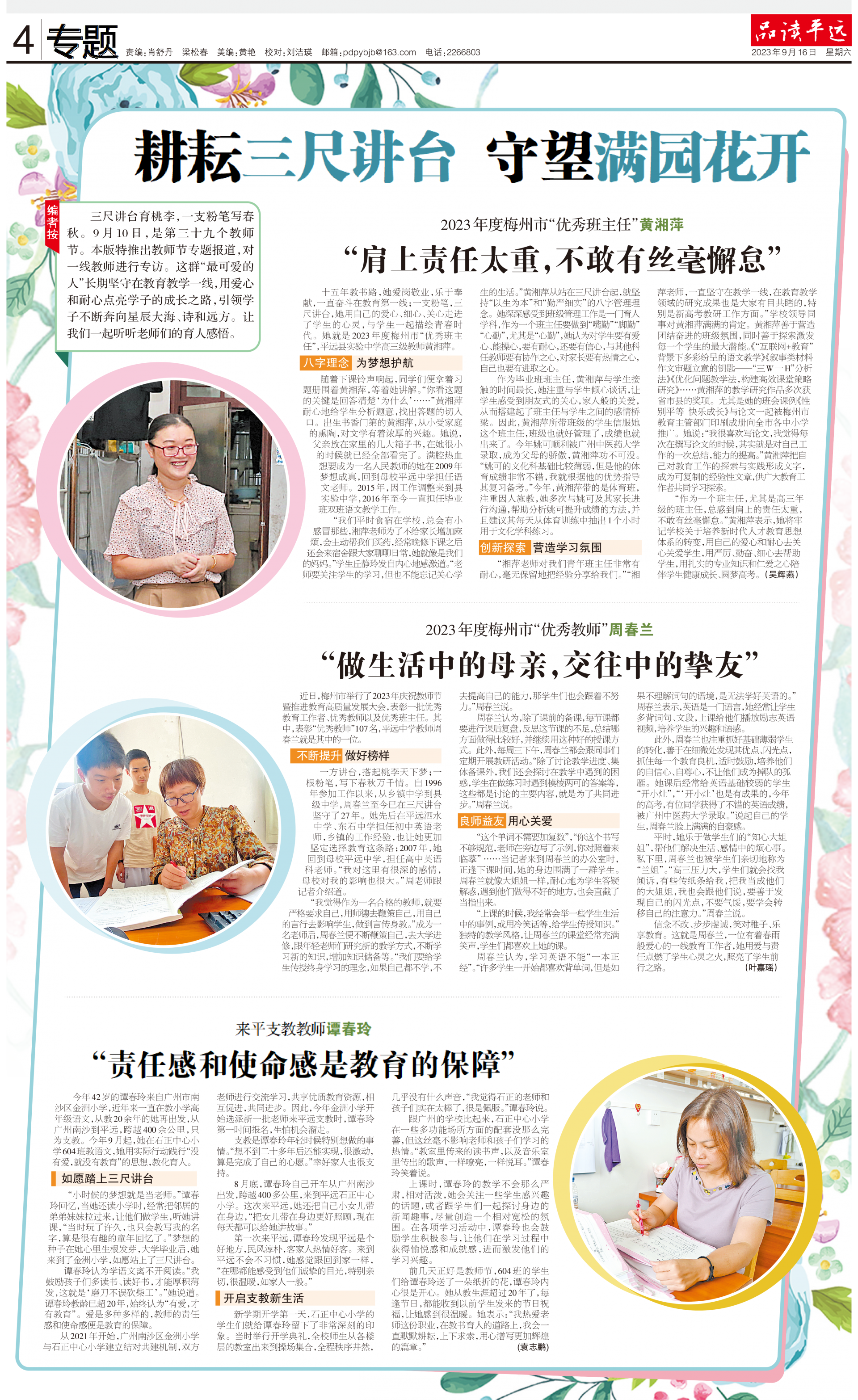 三尺讲台育桃李,一支粉笔写春秋。9月10日,是第三十九个教师节。本版特推出教师节专题报道,对一线教师进行专访。这群“最可爱的人”长期坚守在教育教学一线,用爱心和耐心点亮学子的成长之路,引领学子不断奔向星辰大海、诗和远方。让我们一起听听老师们的育人感悟。
