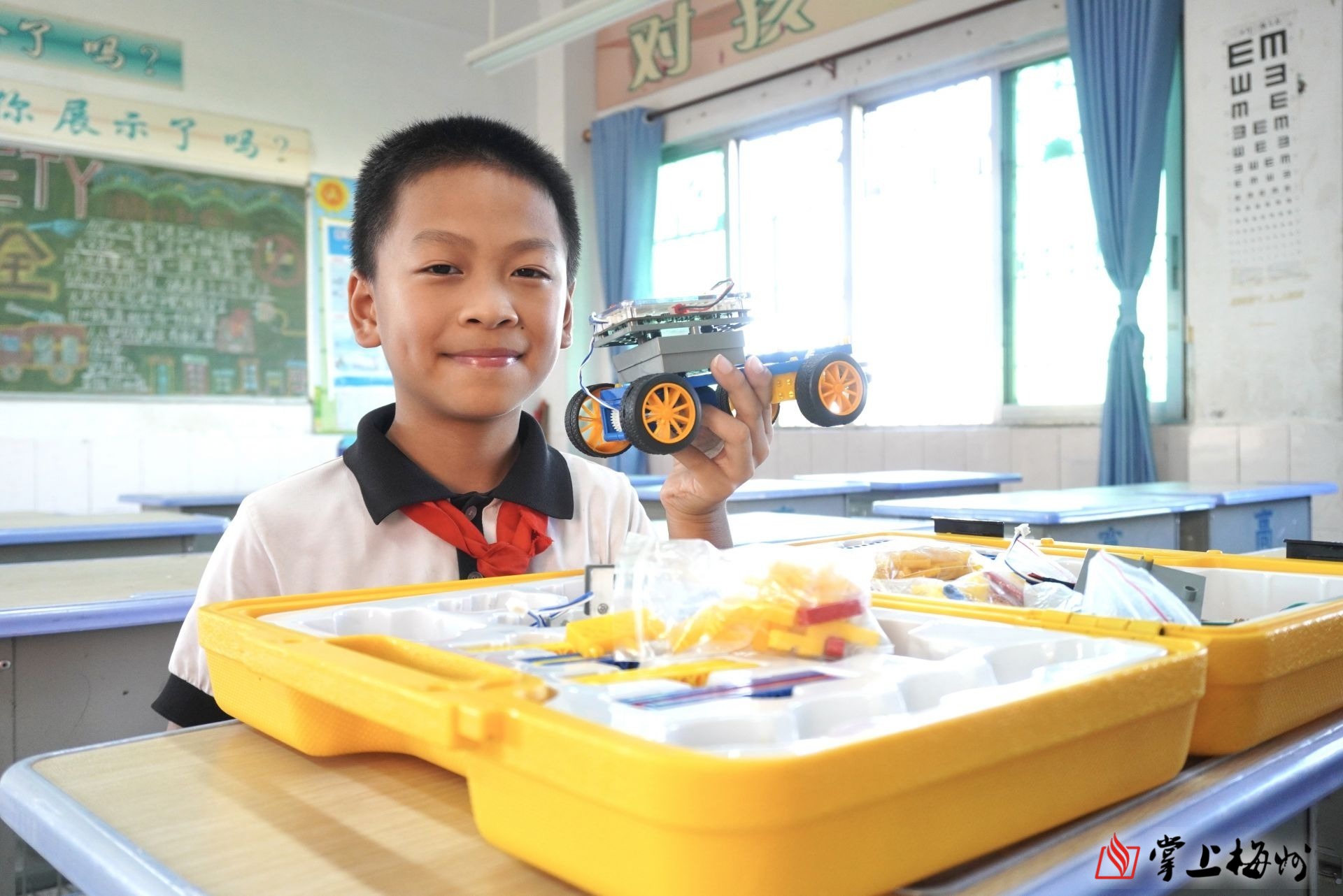 日前,记者在梅江区长沙镇中心小学看到李坤生时,他正在教室内认真地用积木等材料拼装一辆后轮驱动车。“用积木拼装小车其实很简单,输入编程后便可以按照自己的想法启动。”他一面捣鼓着手里的材料,一面向记者解释积木小车的运行原理。