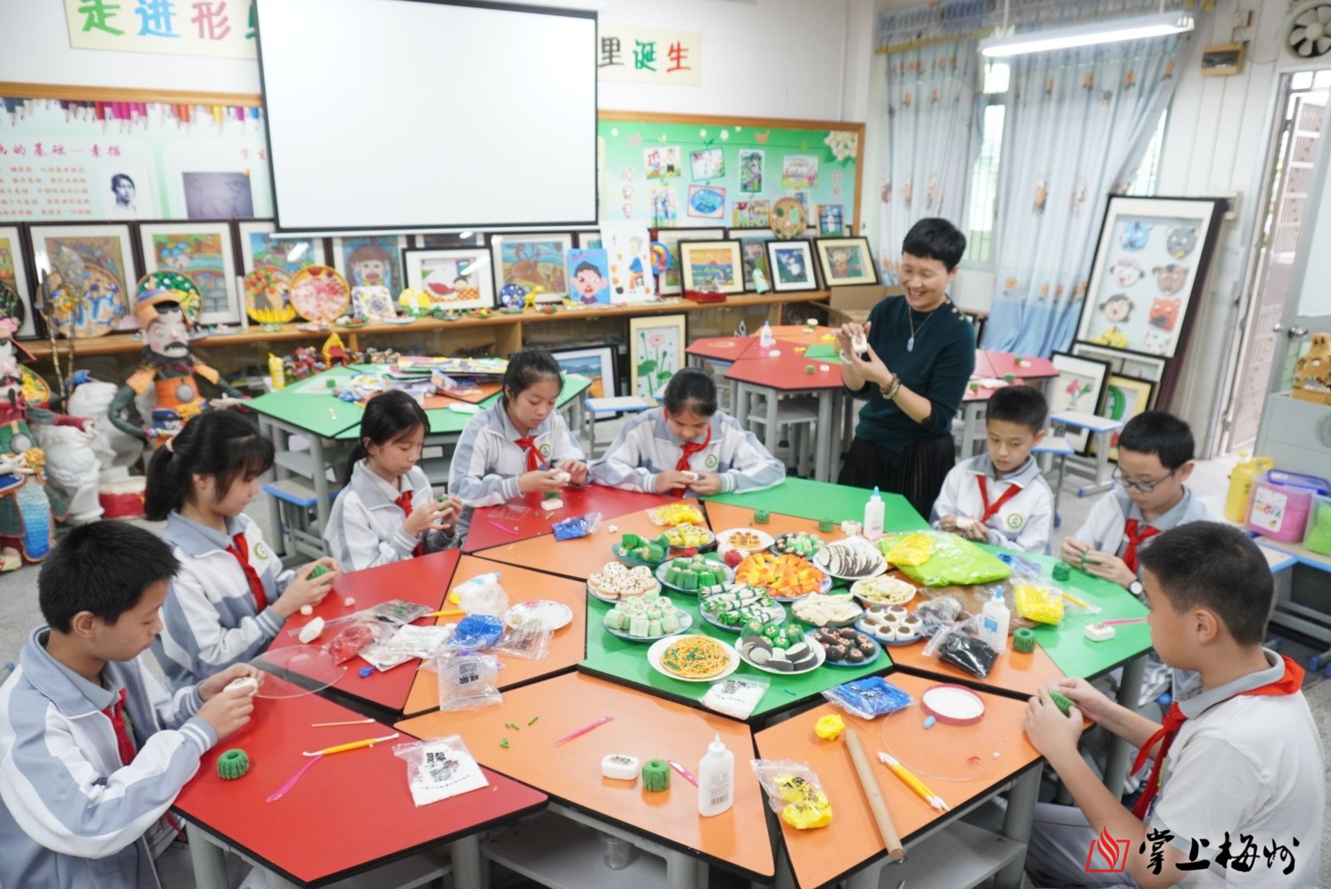“大家注意,先捏出大概形状,再用卡片等工具慢慢雕琢细节……”下午三时,在作新小学的美术教室里,几十个学生正跟着美术老师廖静教的要点,认真学习如何用轻粘土制作客家菜。在手指揉捏之间,通过切、压、粘等技法,酿豆腐、酿丝瓜、酿苦瓜、酿莲藕等一道道逼真又精美的“客家菜”便出炉。