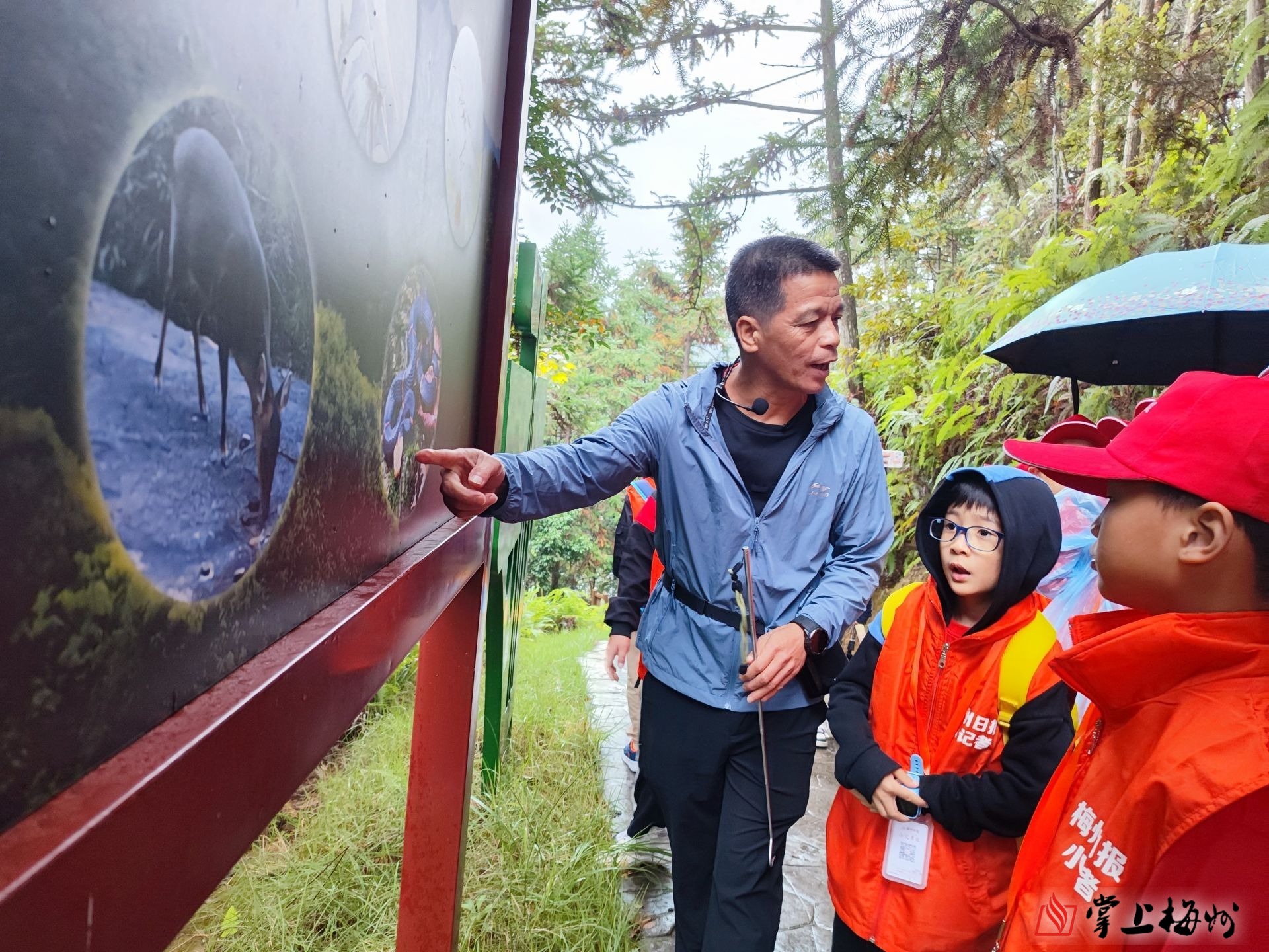 首日,梅州日报小记者们走进龙文——黄田省级自然保护区,与投身自然保护区几十年如一日,坚守大山深处的“鸟叔”陈远忠一起探索森林的奥秘。“这只吃木瓜的鸟,它叫白喉红臀鹎……”在森林里,小记者们与“鸟叔”学习与小鸟交流,他们围绕在陈远忠身旁问起十万个为什么,“老师,保护区里有老虎吗?”“老师,这种野生菌叫什么?有毒吗?”这些问题都会在陈远忠深入浅出的讲解中,在身临其境的体验中,让学生们更加深入地了解野生动植物保护等自然生态知识,有力地促进青少年生态文明意识的培育和养成。