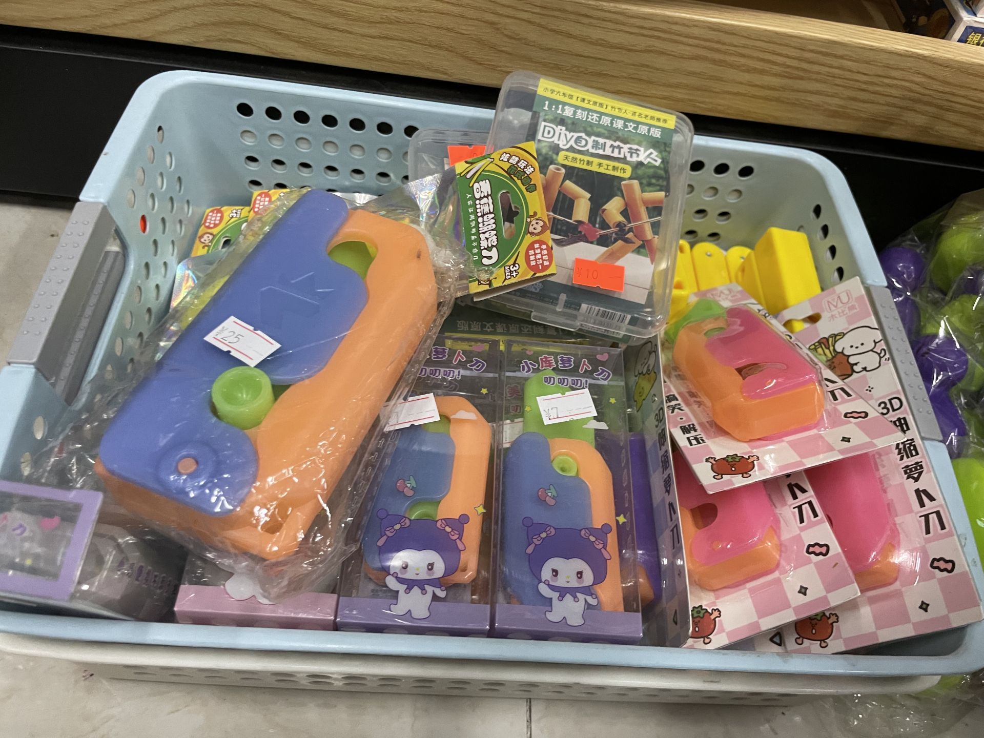 另外一位二年级学生辰辰告诉记者,他们班里也有人在玩“萝卜刀”,学校禁止带玩具等物品,但还是有人会把“萝卜刀”偷偷带到学校里,“大家都很喜欢玩,会交换着不同的款式玩,课间随手甩两下真的很解压,有时候男生之间玩,还会互相用‘萝卜刀’捅对方,因为刀尖不尖锐,所以捅人不怎么痛。”