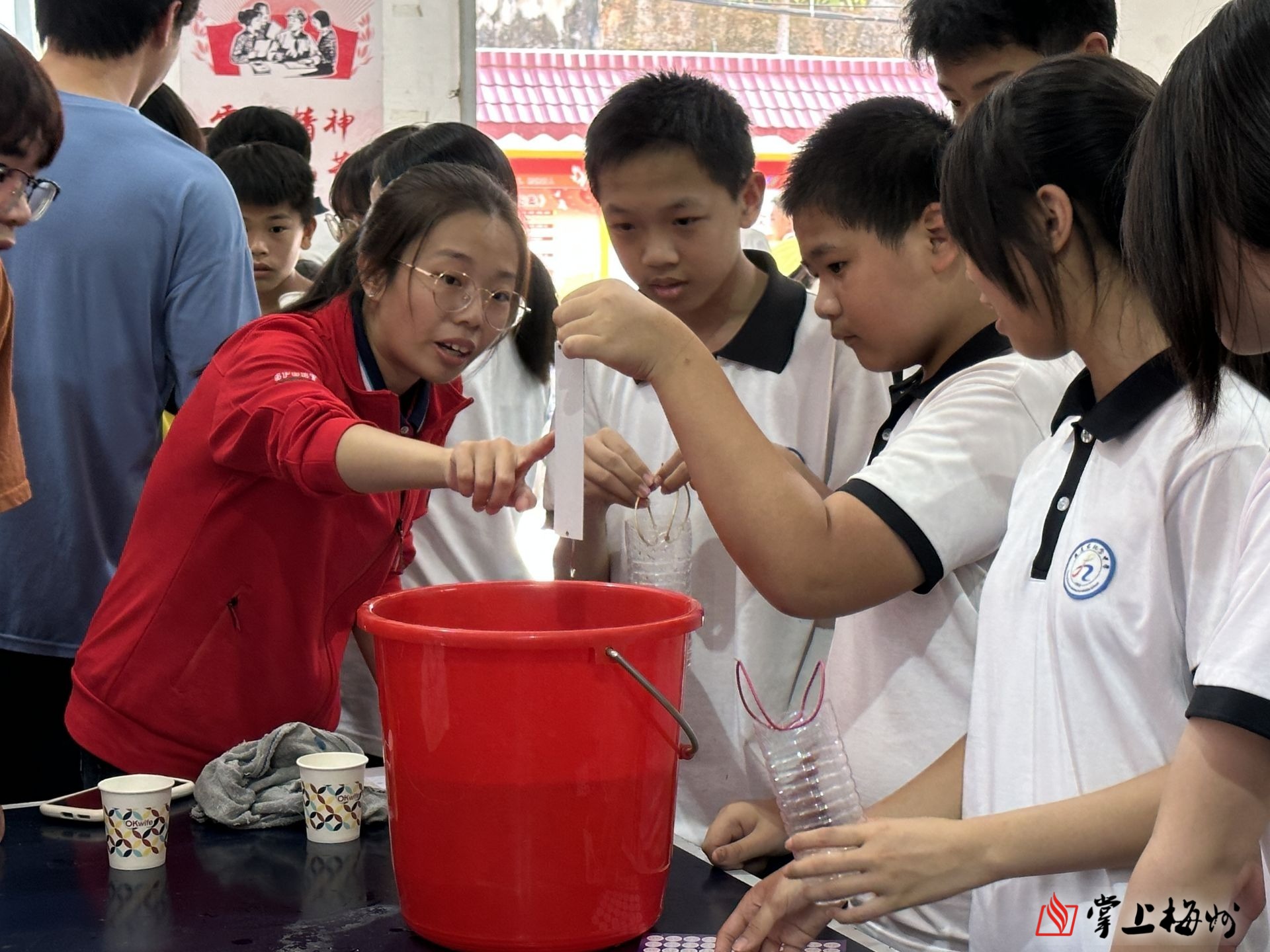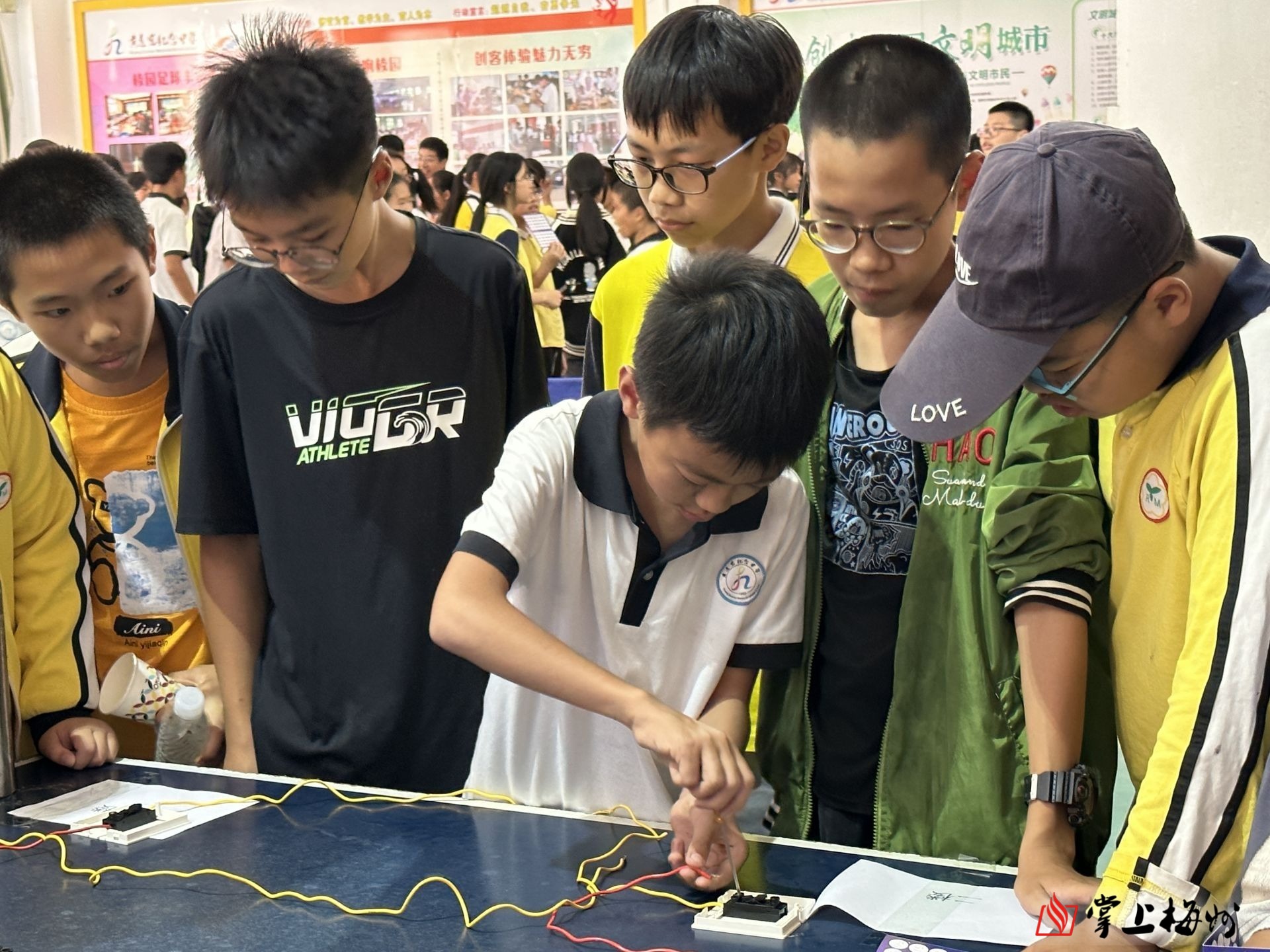 随着机器人舞蹈、航模飞行表演结束后,同学们纷纷来到一楼礼堂参加科创学科知识游园和创客体验游园活动。“老师,为什么我的纸杯飞不起来?”“这个拼图也太简单了吧!”“老师,你看我做的叶脉书签好不好看?”……活动现场,各个展位前人头攒动,同学们或摆弄着手里的拼图认真拼着,或拿着螺丝刀做着双控开关连接实验,或看着展示架上的谜语陷入沉思。每通过一关的“考验”,摊位前的老师都会给学生事先领取的集章卡上盖章,集齐一定数量的奖章就可以参与兑奖活动。