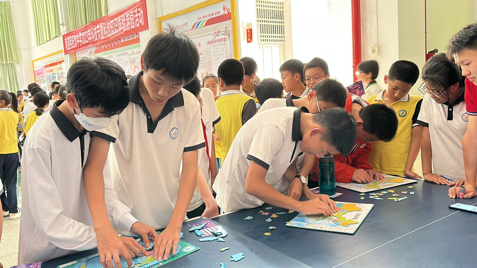 地理拼图比赛摊位上,同学们拼得很认真。(廖玉芳 摄)