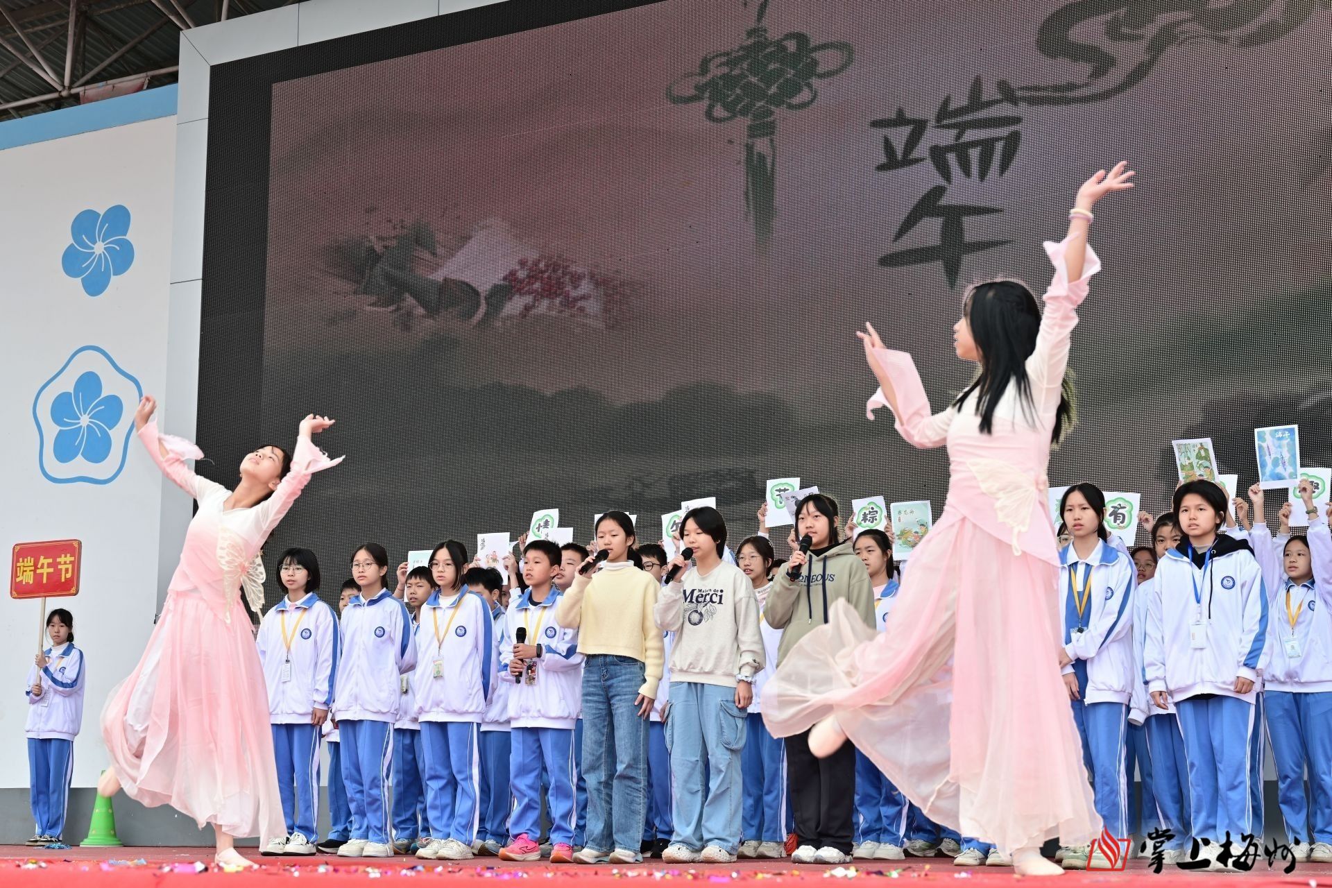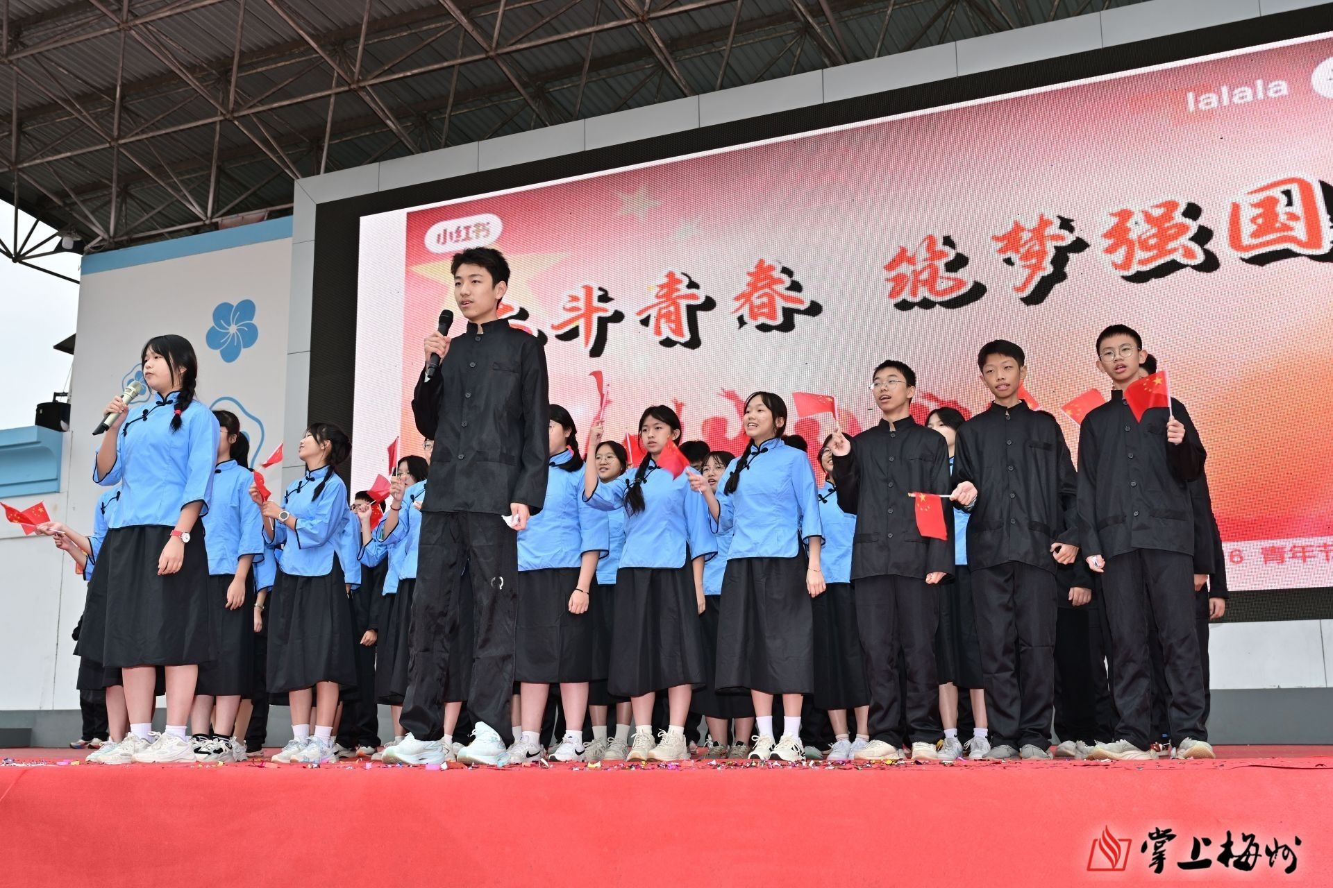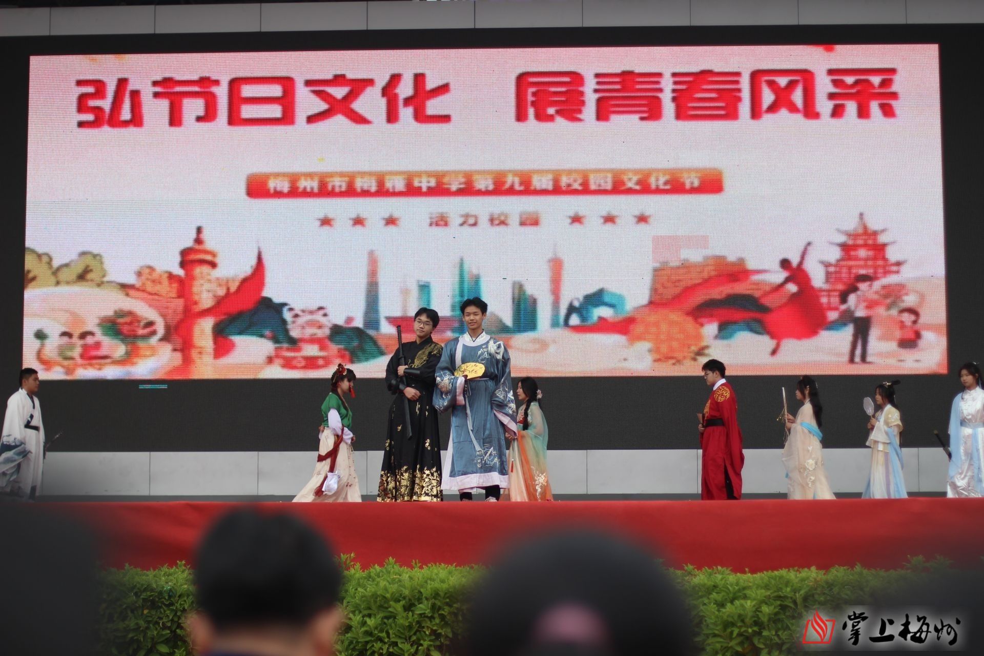 活动伊始,在激昂的乐曲声中,护旗队成员英姿飒爽、步履铿锵,护送着国旗,昂首阔步地向主席台走来。紧随其后的是学校文化节牌匾守护队、鼓号队和彩旗队,他们步伐矫健,精神抖擞,在激昂的鼓点和响亮的号角中,展现出梅雁学子们的蓬勃朝气与活力。紧接着,围绕“弘节日文化展青春风采”这个主题,学校64个教学班按照各个节日或纪念日的时间顺序,分为32个方队,以歌舞表演、诗歌朗诵、情景剧、T台走秀等表演形式演绎了春节、元宵节、学雷锋纪念日、妇女节、植树节、护士节、母亲节、劳动节、中秋节、重阳节等节日的文化与习俗,表演各具特色,创意满满,亮点纷呈,展现了节日背后深邃丰厚的文化底蕴与价值内涵,传统节日与现代节日兼具,民族节日与世界节日兼容,体现了梅雁学子“立足中国、放眼世界”的开阔视野和“扎根传统、博览现代”的综合素养,为全场师生带来了一场精彩绝伦的视觉盛宴,激发了同学们的家国情怀,增进了同学们的文化自信和民族认同感。