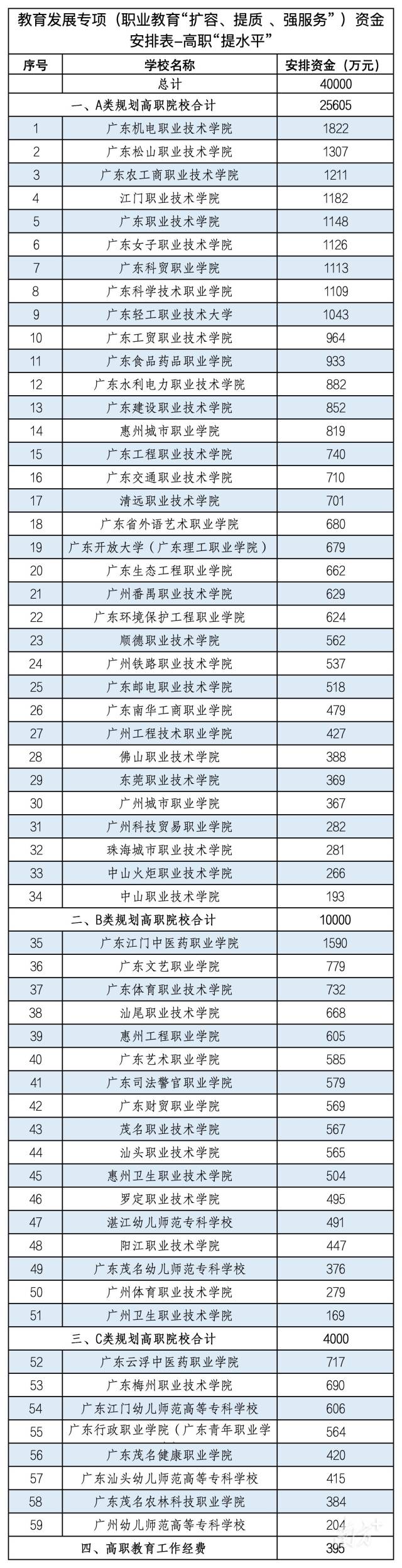 高职院校根据广东高职“创新强校工程”考核分为A、B、C三类,34所A类规划高职院校共获得25605万元;17所B类高职院校共获得10000万元,8所C类高职院校共获得4000万元。
