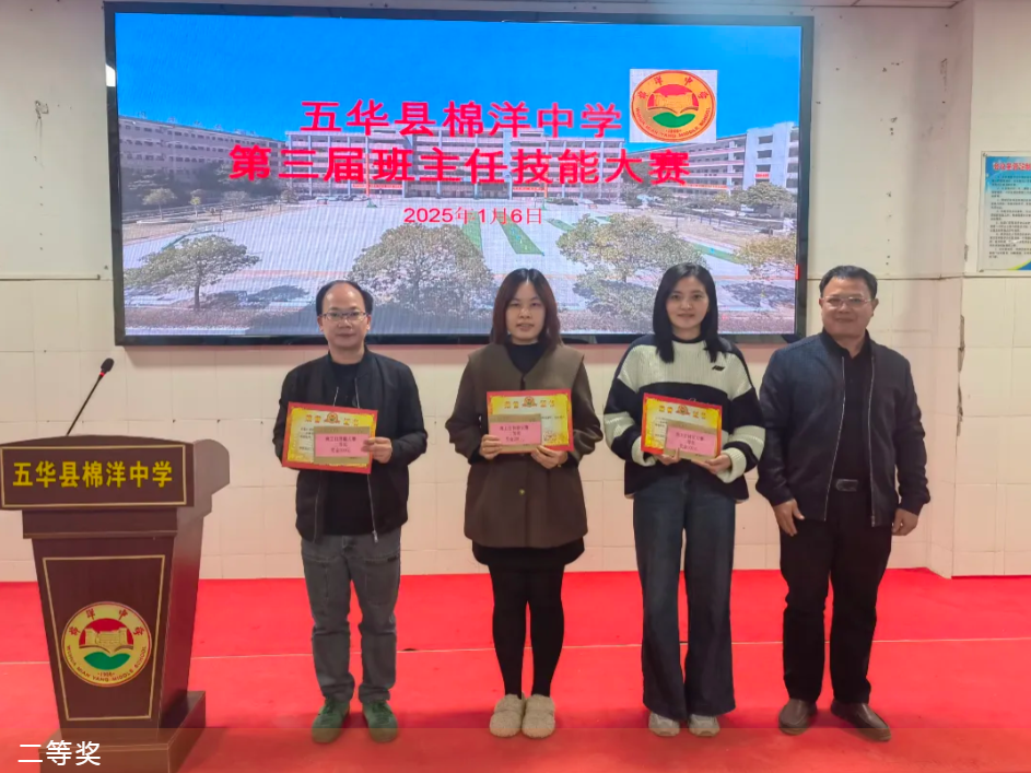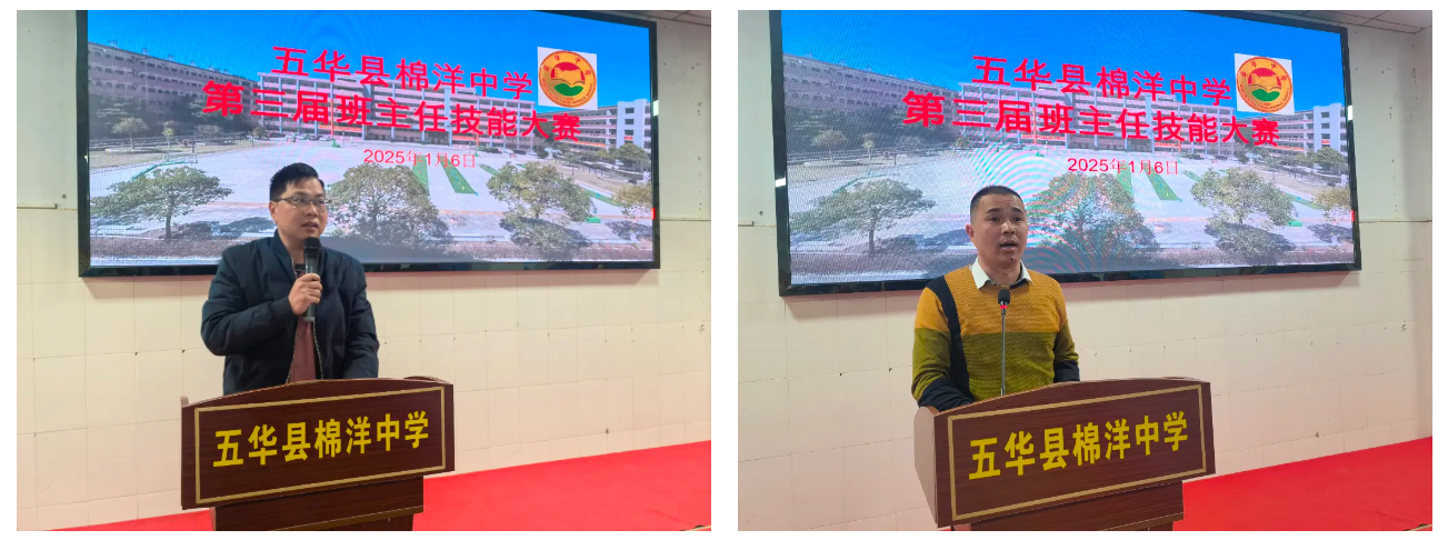 为有效提高五华县棉洋中学德育教育工作的实效性,促进德育工作者育人技能和水平的提升,增强班主任团队的使命感、责任感、荣誉感、归属感,加强教师学习和交流平台建设,共同探索新时代班级管理的新路径、新方法。2025年1月6日下午,五华县棉洋中学举行班主任技能大赛,大赛由政务处主任谢仲夫主持。本次比赛邀请五华县安流中学和双华中学的领导、老师担任评委。