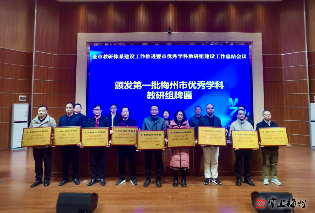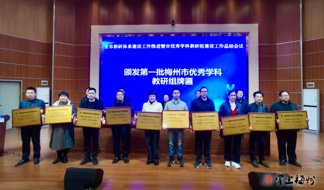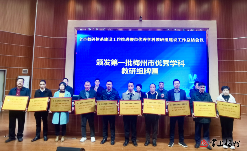 会上为广东梅县东山中学数学组、梅州市曾宪梓中学地理组等100个首批市优秀学科教研组授牌,为第二批124名学科兼职教研员颁发了聘任证书。