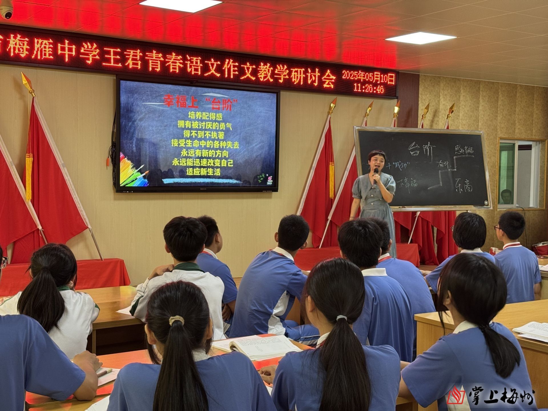 研讨会上,王君和全国王君青春语文名师工作室成员陆艳、沈肖凤以三堂特色语文课为载体,呈现读写融合教学的多元创新路径。王君在讲授《台阶》时聚焦文本深层解读,以“父亲的幸福困境”为切入点,引领学生探讨奋斗哲学与生命感知的双重命题;陆艳以真实情境为引,结合《驿路梨花》经典案例解析,教授学生们“把事故变成故事”的写作技巧;沈肖凤通过解码《陋室铭》托物言志手法,带领学生挖掘“梅雁”文化内涵,完成《梅雁铭》填空式创作。