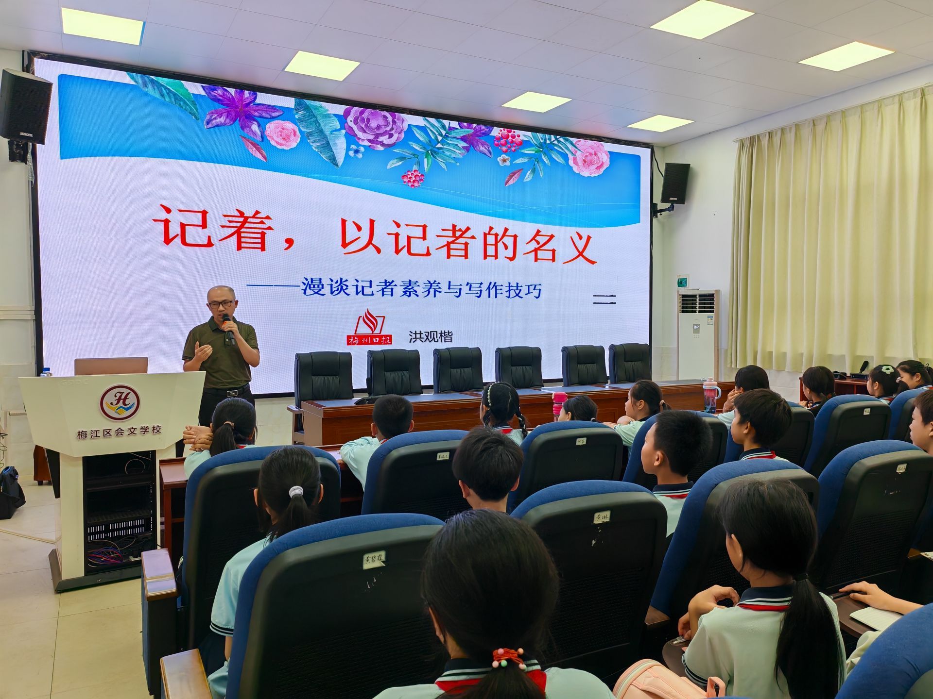 掌上梅州讯 新闻记者是什么样的职业?如何提高写作水平?……5月14日下午,梅州日报社编委、要闻部主任、新闻专业主任编辑(副高)、“学习强国”梅州学习平台编辑部负责人洪观楷走进梅江区会文学校,以《记着,以记者的名义——漫谈记者素养与写作技巧》为主题开讲,该校120多名学生聆听了这场讲座。