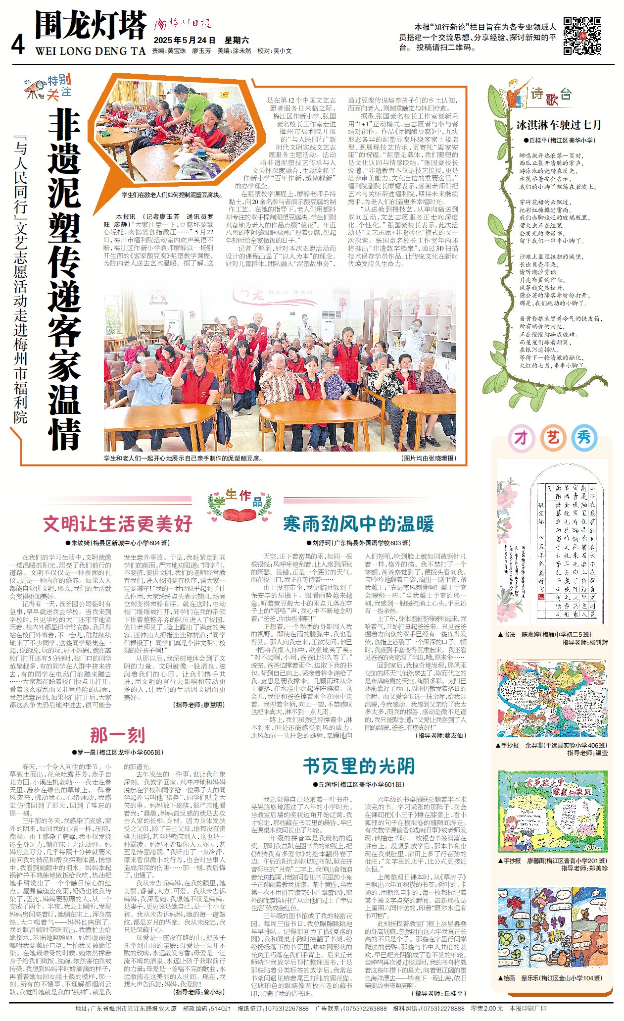 掌上梅州讯 “大家注意一下,豆腐坯要掌心轻托,肉馅需食指微压……” 5月22日,梅州市福利院活动室内欢声笑语不断,梅江区作新小学教师廖静以一场别开生面的《客家酿豆腐》泥塑教学课程,为院内老人送去艺术温暖。据了解,这是在第12个中国文艺志愿者服务日来临之际,梅江区作新小学、张国豪名校长工作室走进梅州市福利院开展的“与人民同行”新时代文明实践文艺志愿服务主题活动。活动将非遗泥塑技艺传承与人文关怀深度融合,生动诠释了作新小学“百年作新,越做越新”的办学理念。
