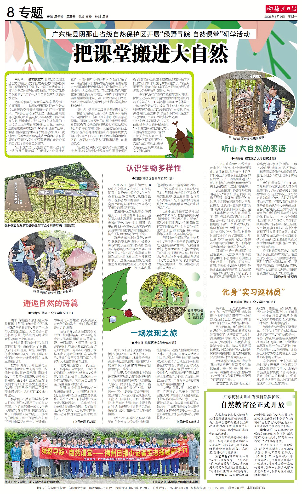 本报讯 (记者廖玉芳)日前,80位梅江区会文学校山花文学社成员走进广东梅县阴那山省级自然保护区“林中探秘”自然教育径,探访鸟类、观察昆虫、辨别植物,“沉浸式”体验自然教育,开启了一场与自然深度对话的奇妙之旅。