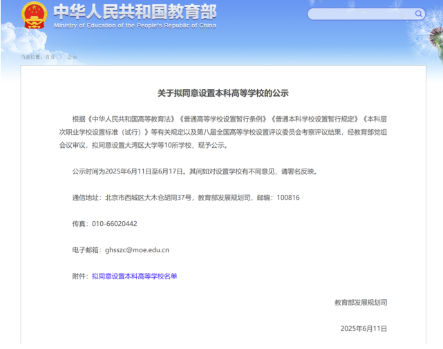 6月11日,教育部官方发布关于拟同意设置本科高等学校的公示。公示称,拟同意设置大湾区大学等10所学校。
