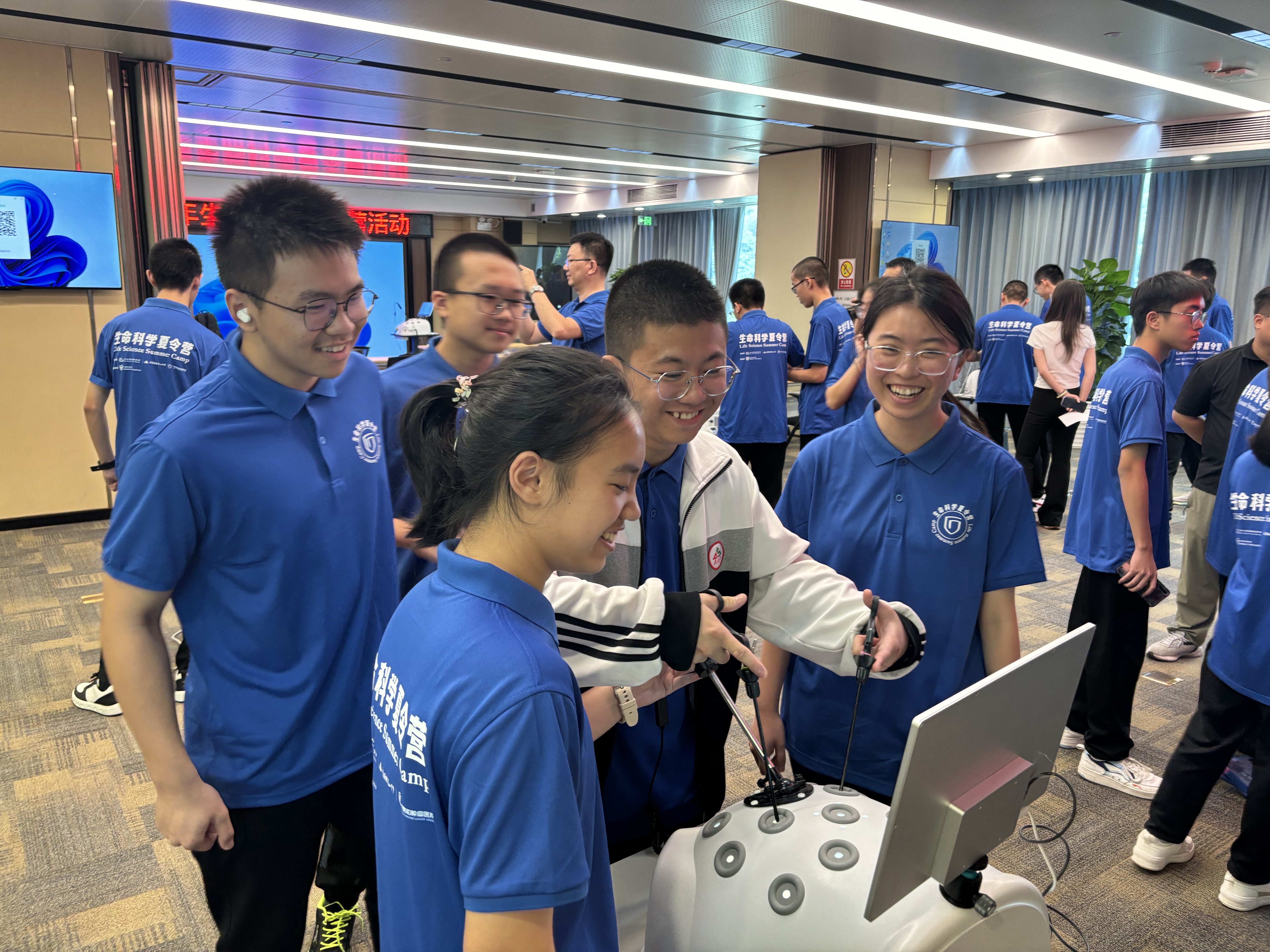 7月19日的研学活动在广州国际生物岛展开。岛上汇聚了众多顶尖生物科技企业和研发机构,被誉为“生物界大脑”。在瑞派公司,同学们学习了一次性内窥镜的构造与临床应用,了解微创技术如何提升手术的安全性与效率。随后,在创新转化空间,同学们分组体验了微创手术模拟,尝试操作机械臂夹取与分离模拟“病灶”。一位同学在日记中写道:“握着机械臂,我感受到技术的复杂与对生命的敬畏。”下午,同学们则参观了百济神州的生产研发中心,深刻理解了生物药技术的救命意义。