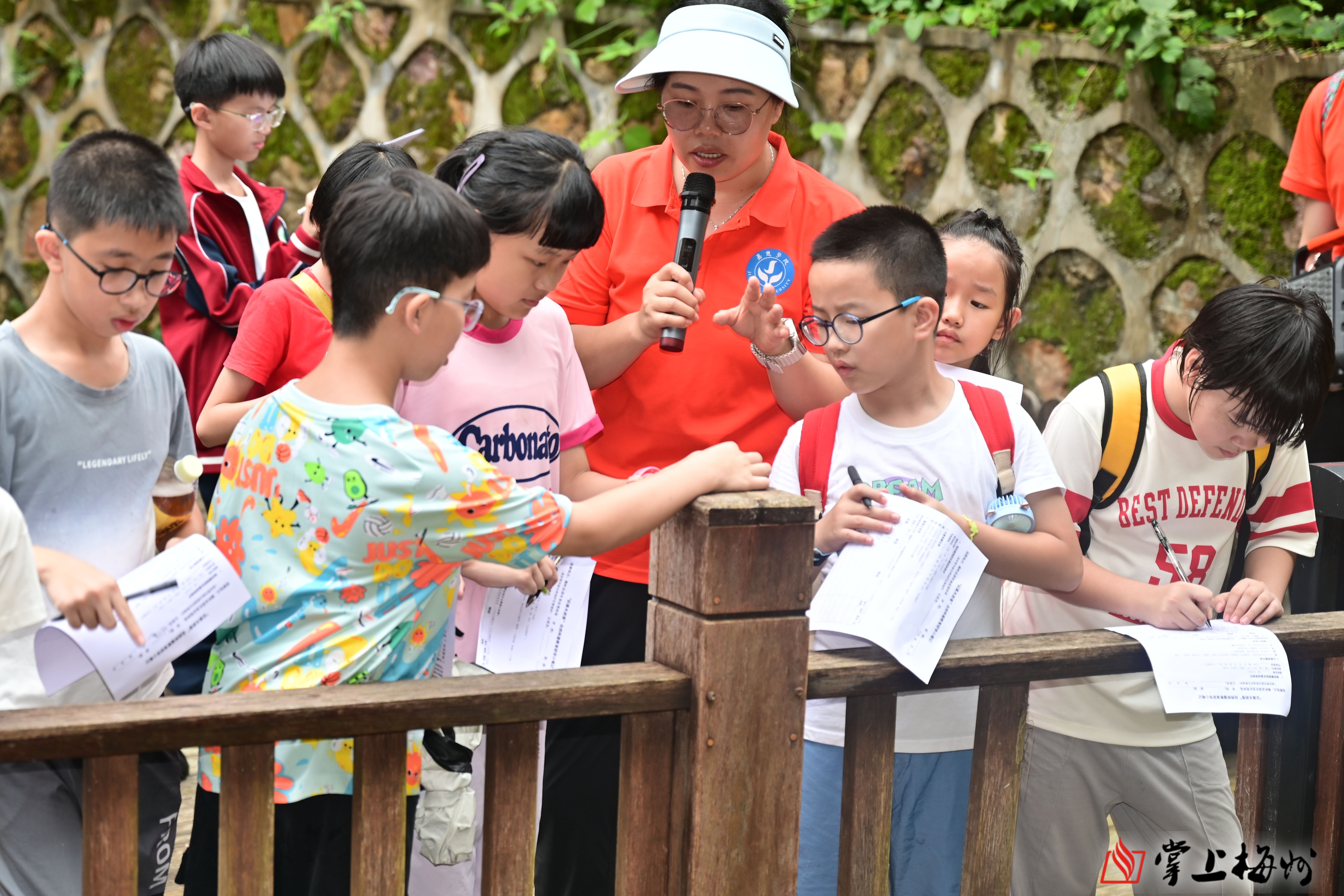 在自然科普导师的带领下,小记者们化身“小药童”,沿着自然教育径线路开展丰富有趣的自然课程。他们一边聆听老师讲解,一边认真记录“自然笔记”,他们好奇地触摸着每一株植物,辨认着枇杷树、苏铁蕨、鬼针草等南药的形态、种类和功效,逐步对南药的特性有了初步的了解。