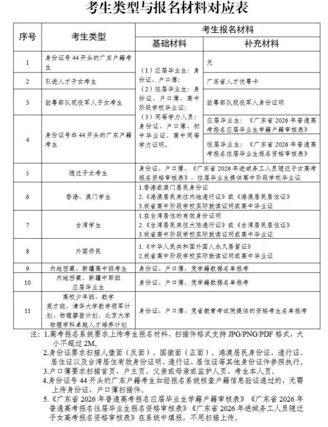 需要注意的是,具有广东户籍的应、往届毕业生,如户籍迁入时间或学籍(学历)未达到广东普通高考报名条件的,可以在广东报名参加普通高考,但只能参加高职院校(专科)批次录取,不能参加本科批次录取。学制少于三年的高中阶段学校毕业生,其初中毕业时间到高考当年8月31日不满3年的,可以在广东报名参加普通高考,但只能参加高职院校(专科)批次录取,不能参加本科批次录取。此外,考生不得在广东和其他省份同时参加2026年普通高考报名。