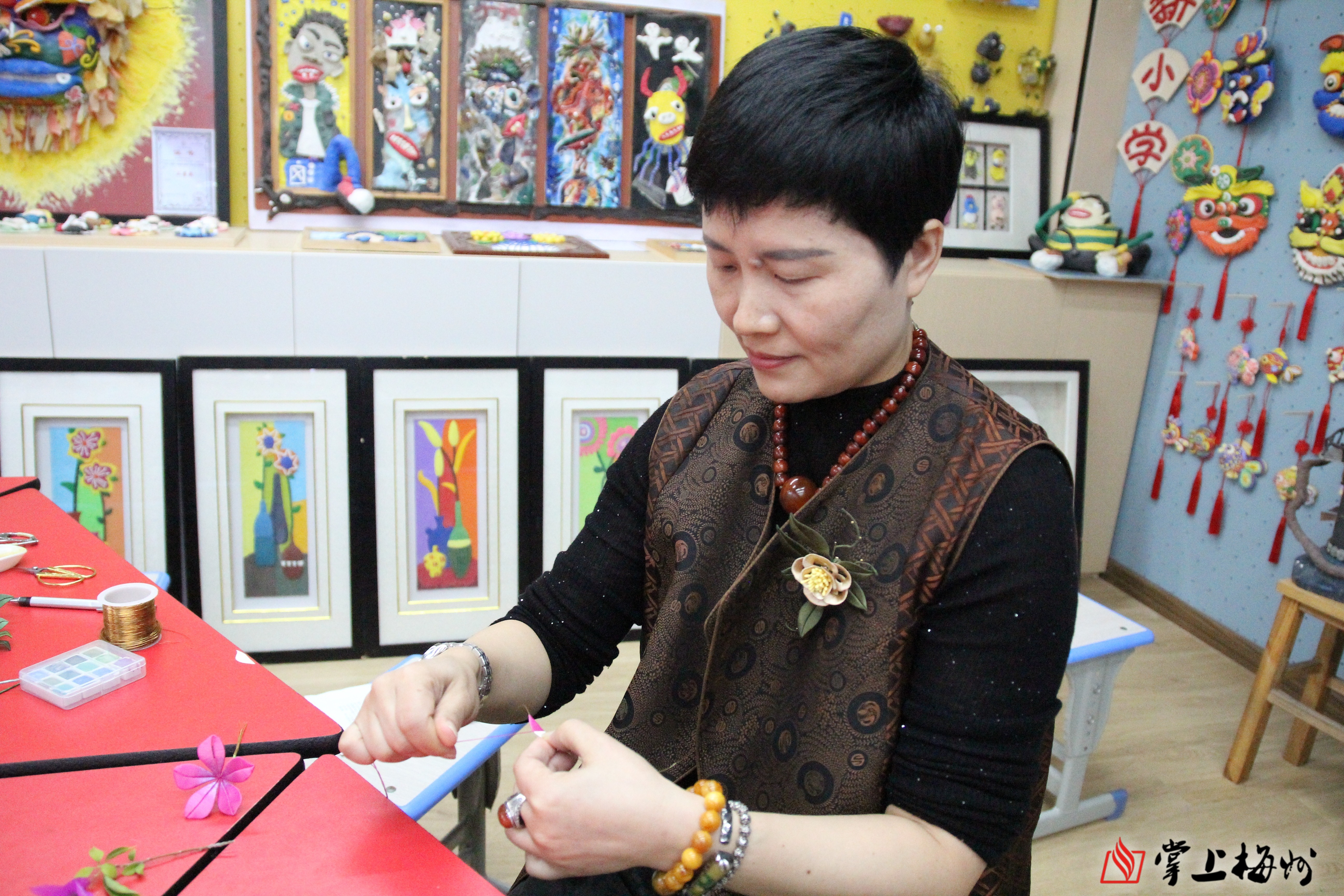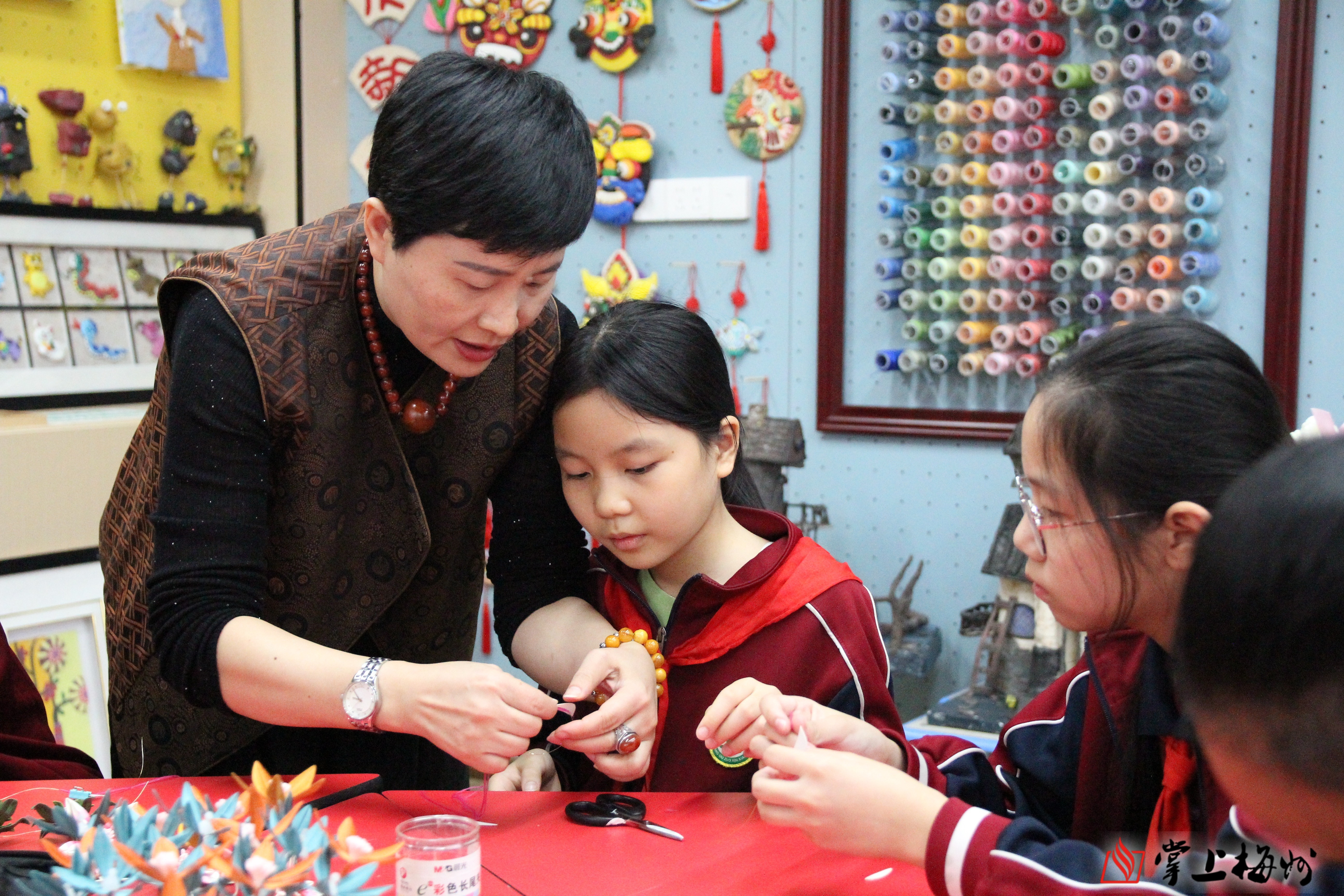 廖静正在学校的创意美术工作坊里教学生制作缠花。