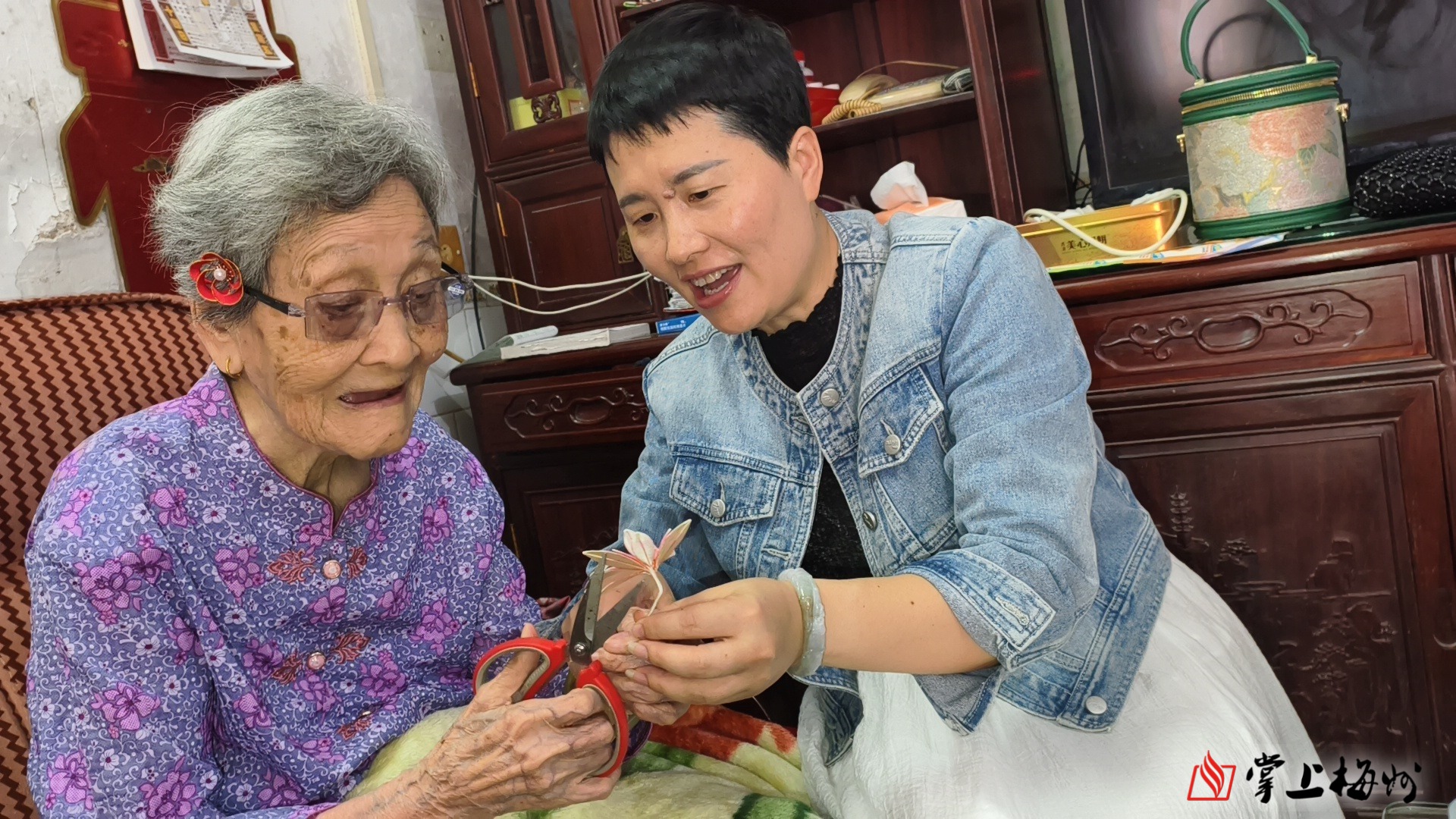 廖静与外婆在探讨缠花技艺。(受访者供图)
