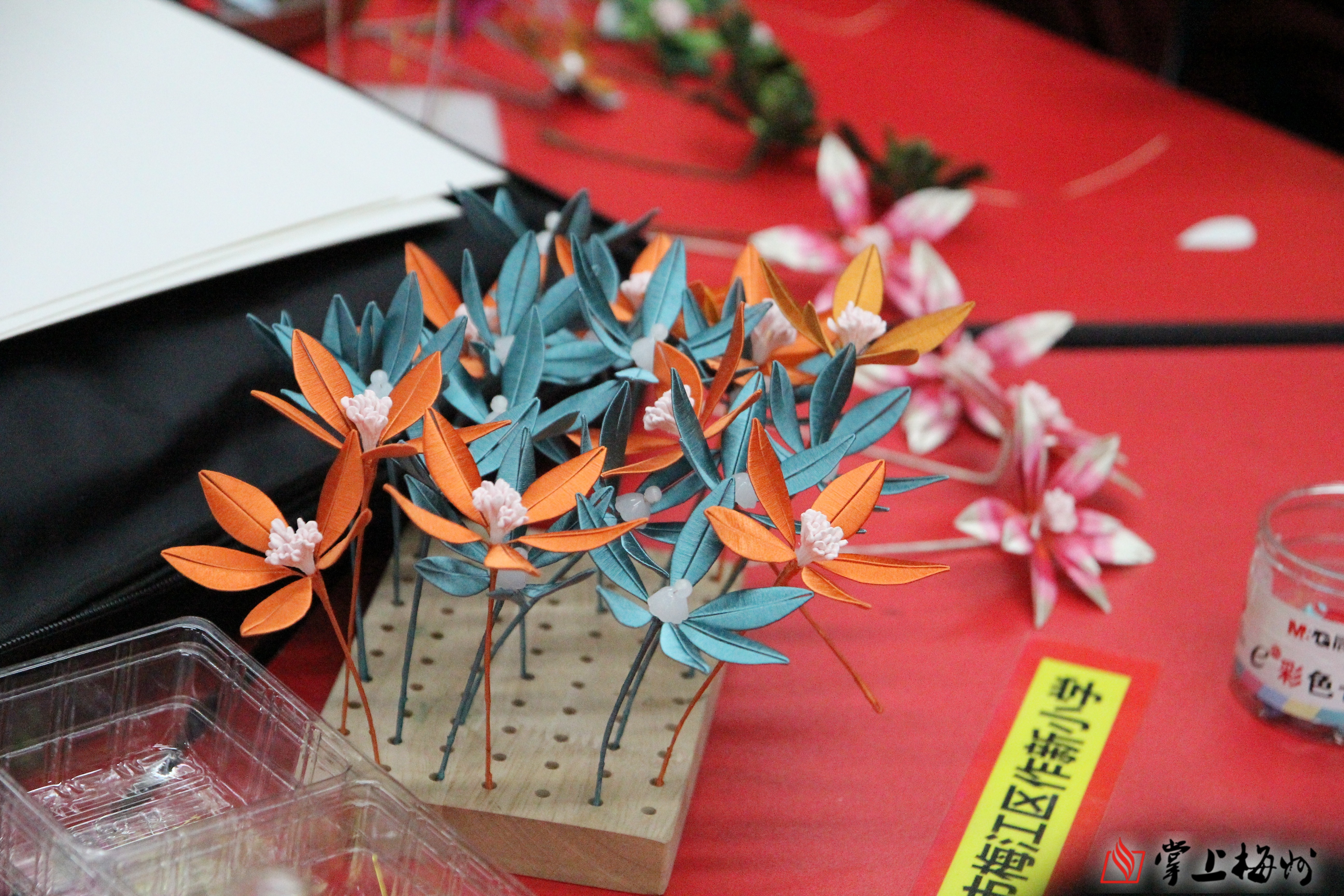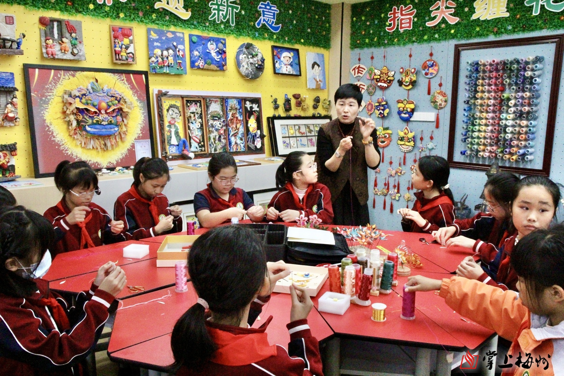 课堂之外,她组建缠花创意艺术工作坊,挑选手艺好的学生共创作品。孩子们的创造力常让她惊喜:有人提议把缠花做成书签送笔友,有人想为妈妈做缠花发簪当礼物,还有人说“要把梅州梅花做成缠花,让外地朋友知道家乡文化”。“看到他们愿意动手、愿意分享,我就觉得传承有了奔头。”廖静笑着说。