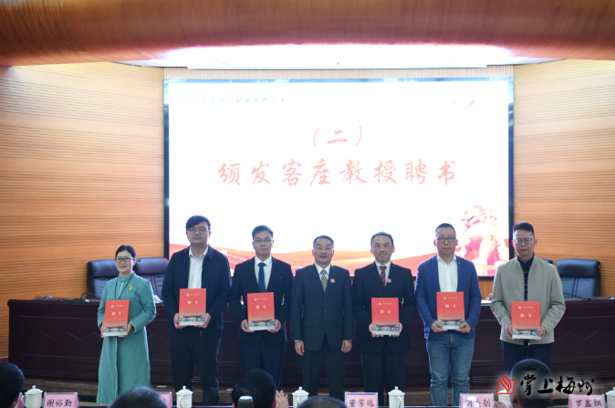 学校临时党委书记董芳远为刘锐君、苏勇平、陈钢文、李宇翔、叶敬敏、陈统等六位来自行业企业的专家颁发客座教授聘书,此举将推动产业前沿技术与课堂教学同频共振,深化产教融合,为梅职院人才培养注入产业基因。随后,学校临时党委委员谢裕勤为“梅州市畜禽绿色养殖与生物防控工程技术研究中心”及胡健欣博士工作室授牌,标志着学校在科研平台建设与高层次人才引育上实现新突破,为技术研发与成果转化搭建起重要载体。