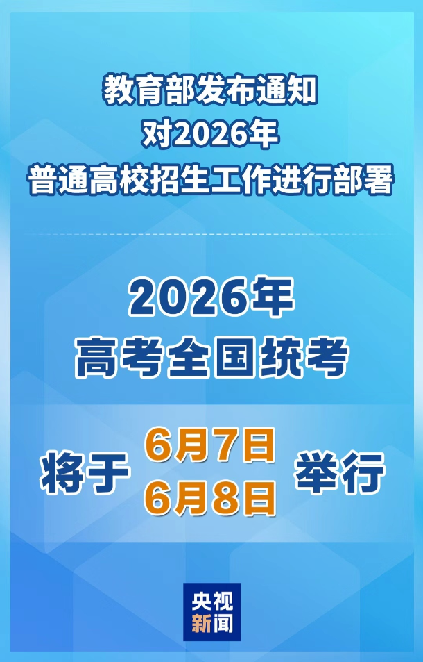 教育部今天(22日)发布通知,对2026年普通高校招生工作进行部署,2026年高考全国统考将于6月7日、8日举行。
