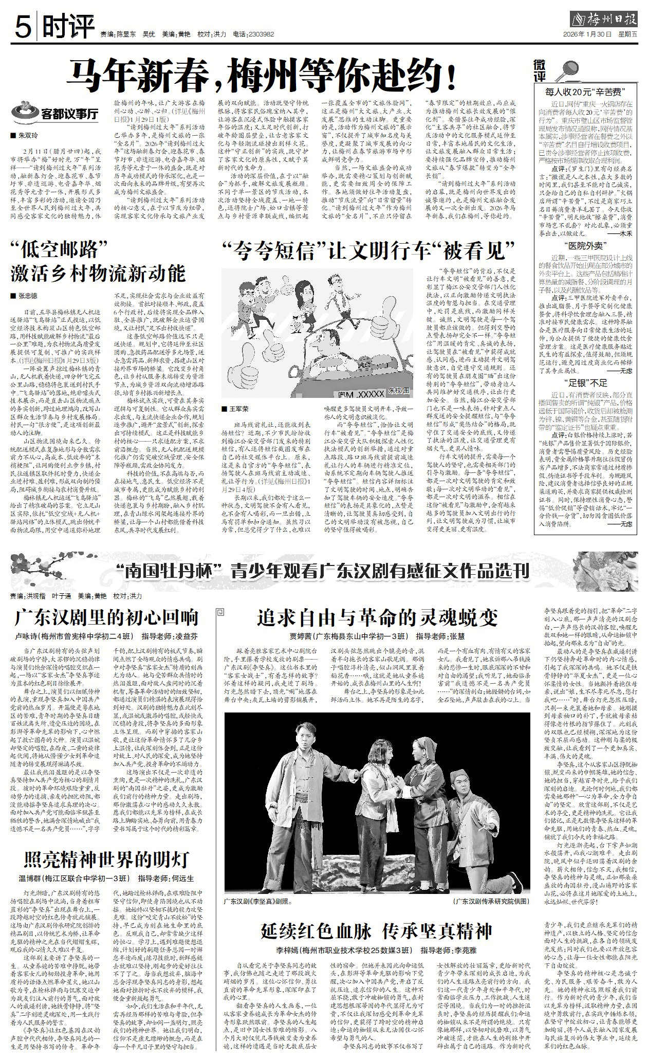 踩着亮胜客家艺术中心剧院台阶,手里攥着学校发放的剧票——广东汉剧《李坚真》。这位书本里的“客家女战士”,有着怎样的故事?怀着这样的疑问,我走进了剧场。灯光忽然暗下去,顶光“唰”地落在舞台中央:灰瓦土墙的剪影铺展开,汉剧头弦忽然跳出个脆亮的音,混着半句拖长的客家山歌尾调。那调子唱腔淳朴清亮,似山涧风里裹着稻花香……哦,这就是她从童养媳开始的、成长在梅州山里的人生啊!