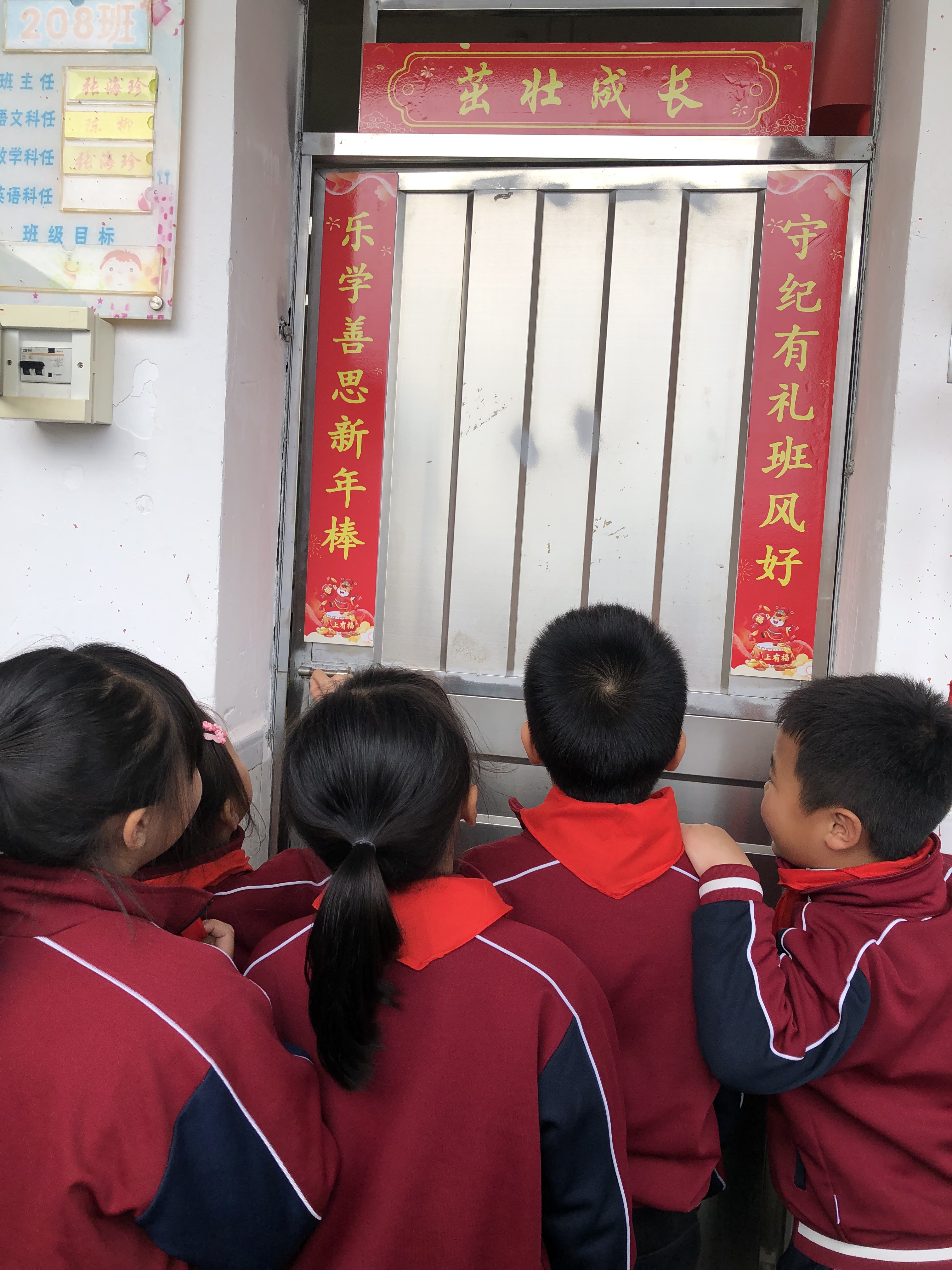 新年到来之际,作新小学的校园里一片红彤彤的,每个班的教室门口都贴上了由师生们共同撰写的对联,以此来激励孩子们在新的一年快马扬鞭、马到成功。图为208班的孩子们在用心体会对联的独特韵味,从小在心田里种下热爱中华文化的种子。
