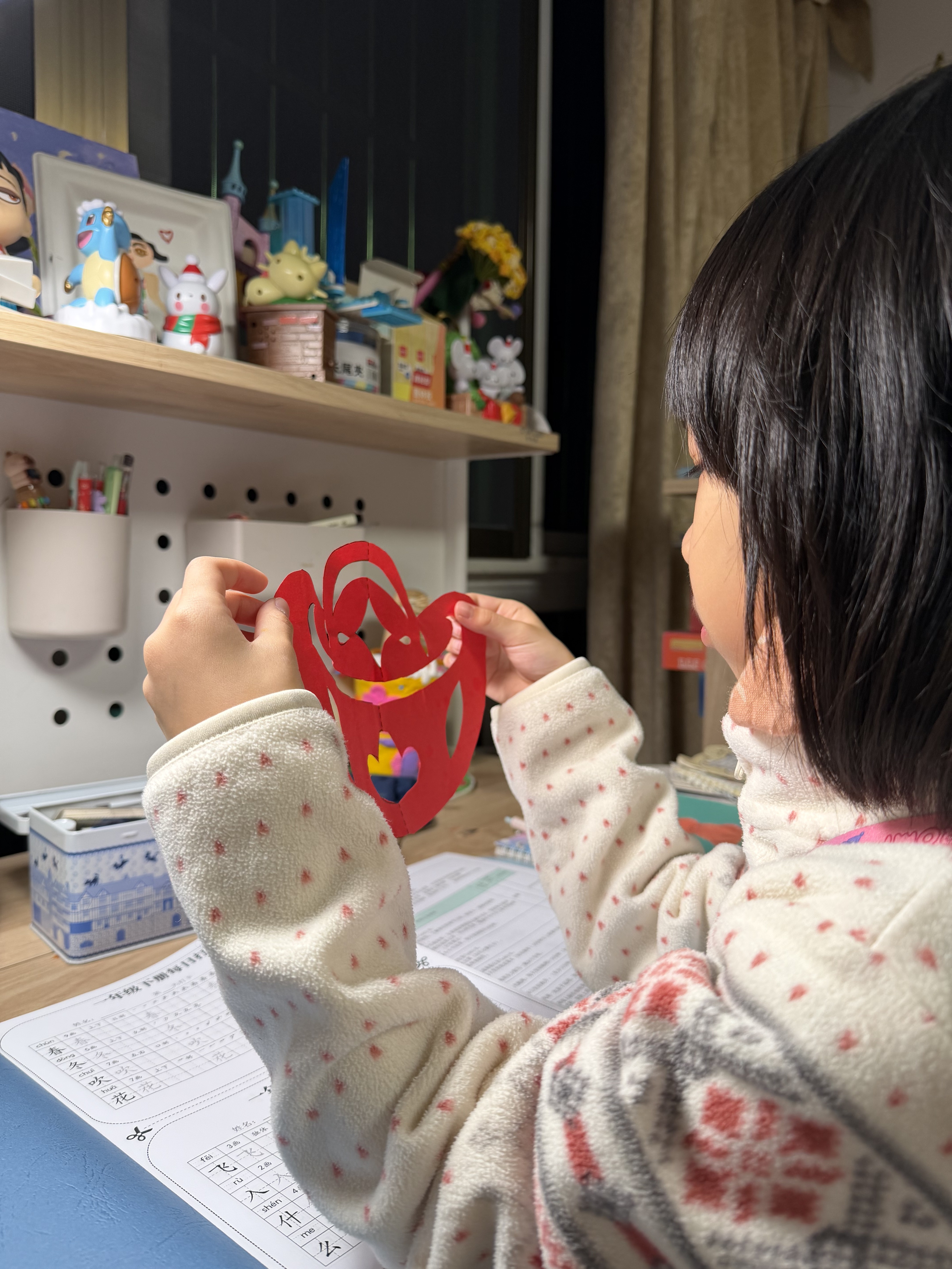 孩子上小学后的第一个寒假作业,可把她乐坏了。学校布置的寒假作业丰富又有趣,除了保证每日一项运动和学习打卡外,还有剪窗花,种植不知名的小植物(种子盲盒),看一场电影,陪爸爸妈妈做一件充满年味的事情——贴对联、买年货、逛花市等等。(黄宝珠 摄)