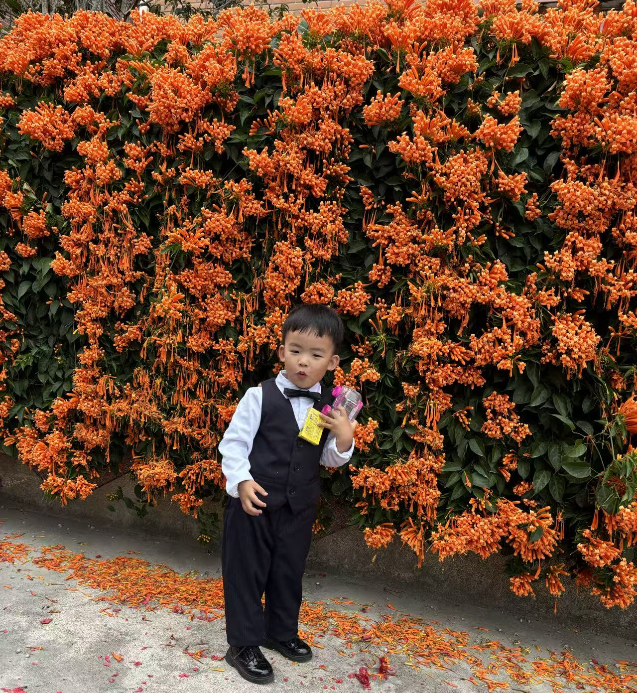 炮仗花宛如被赋予了生命的热情,热烈地盛开着。远远望去,满墙的炮仗花好似被点燃的火焰,橙红色的花串从墙头纷纷垂下头,宛如一串串正在噼里啪啦作响的鞭炮,仿佛在为新年奏响欢快的乐章。走近细瞧,它们宛如一个个小巧玲珑的喇叭,又好似一群群活泼可爱的小精灵,在墙上悠然自得地玩耍、欢快地歌唱。一阵微风轻轻拂过,一缕淡淡的花香扑鼻而来,令人心旷神怡。瞧,一朵朵炮仗花宛如一个个闪烁的小灯泡,晃呀晃呀,仿佛在向人们传递着春天的气息。