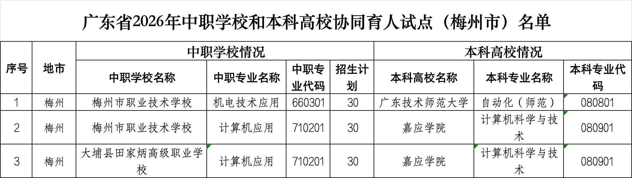 梅州市职业技术学校机电技术应用专业招生30人,对接广东技术师范大学自动化(师范)专业,为今年新增的试点班;该校计算机应用专业招生30人,继续对接嘉应学院计算机科学与技术专业。