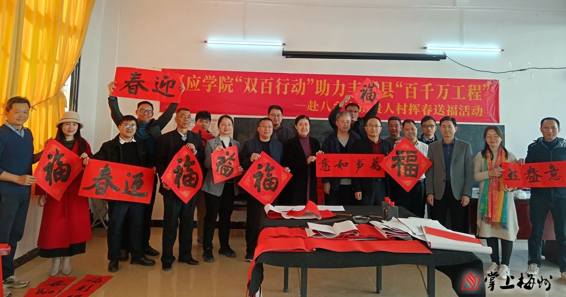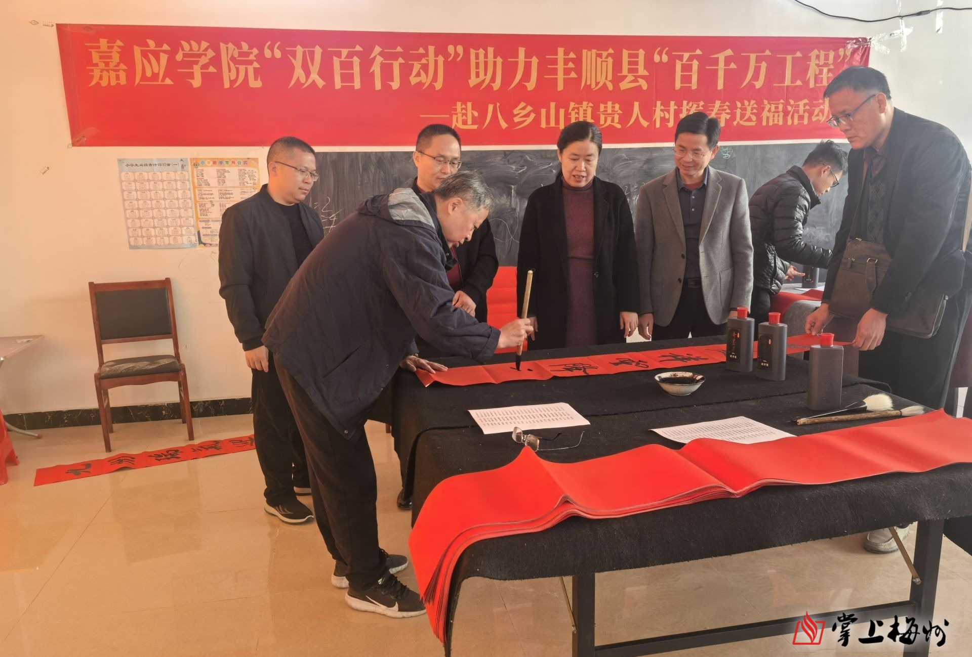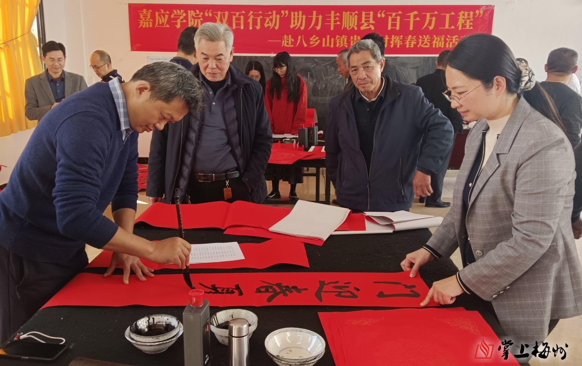在八乡山镇贵人村,梅州市书法家协会主席麻爱民教授等师生现场挥毫泼墨书写春联和福字,现场气氛融洽热烈,洋溢喜庆祥和气息,为八乡山干部群众送去新春的美好祝福,以文化惠民的暖心之举助力乡村文化振兴。