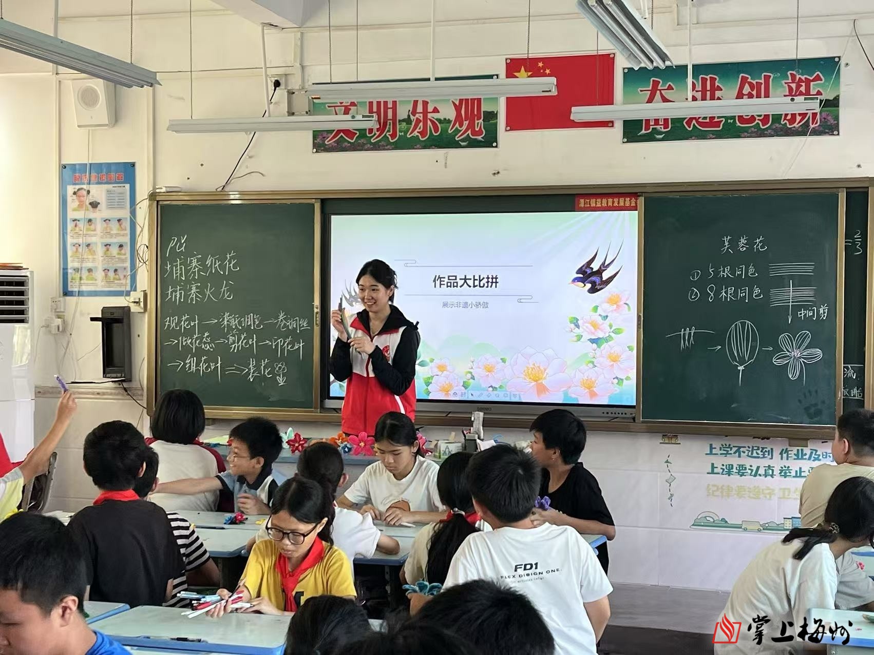 活动中,志愿者们精心设计了系列课程。“声动诗心,唱出诗意”古诗课通过“走进诗意世界”“走进诗‘歌’世界”和“创作属于我们的歌”等环节,引导学生领略古诗韵味与内涵。在“探秘丰顺非遗,巧手绽放纸间花”非遗课堂上,志愿者们图文并茂地介绍了包括埔寨火龙、留隍隍云片糕、黄金姜糖等在内的丰顺各级非遗项目,重点聚焦埔寨纸花,讲述纸花自清乾隆以来的历史与传承故事,概述其精巧的制作工艺,通过动手环节,让学生使用扭扭棒体验“观花叶—组花装”的技法逻辑,并聆听省级非遗代表性传承人张立绳“坐冷板凳”坚守非遗的故事。