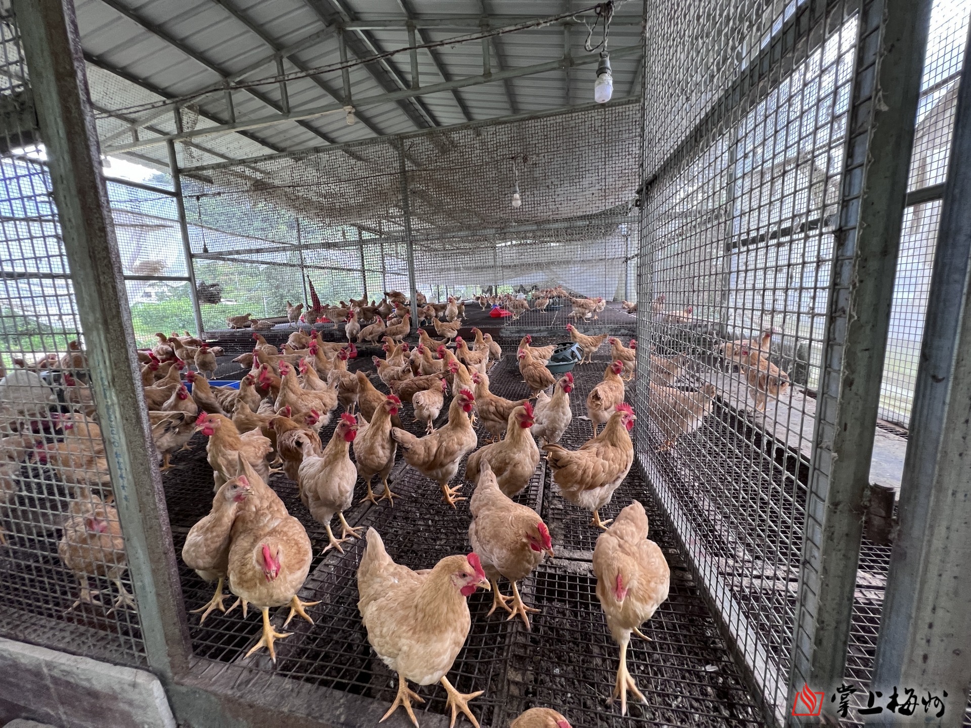 在丰顺县田苑种养专业合作社,鸡舍内的“山苍子无抗鸡”生长状态良好。